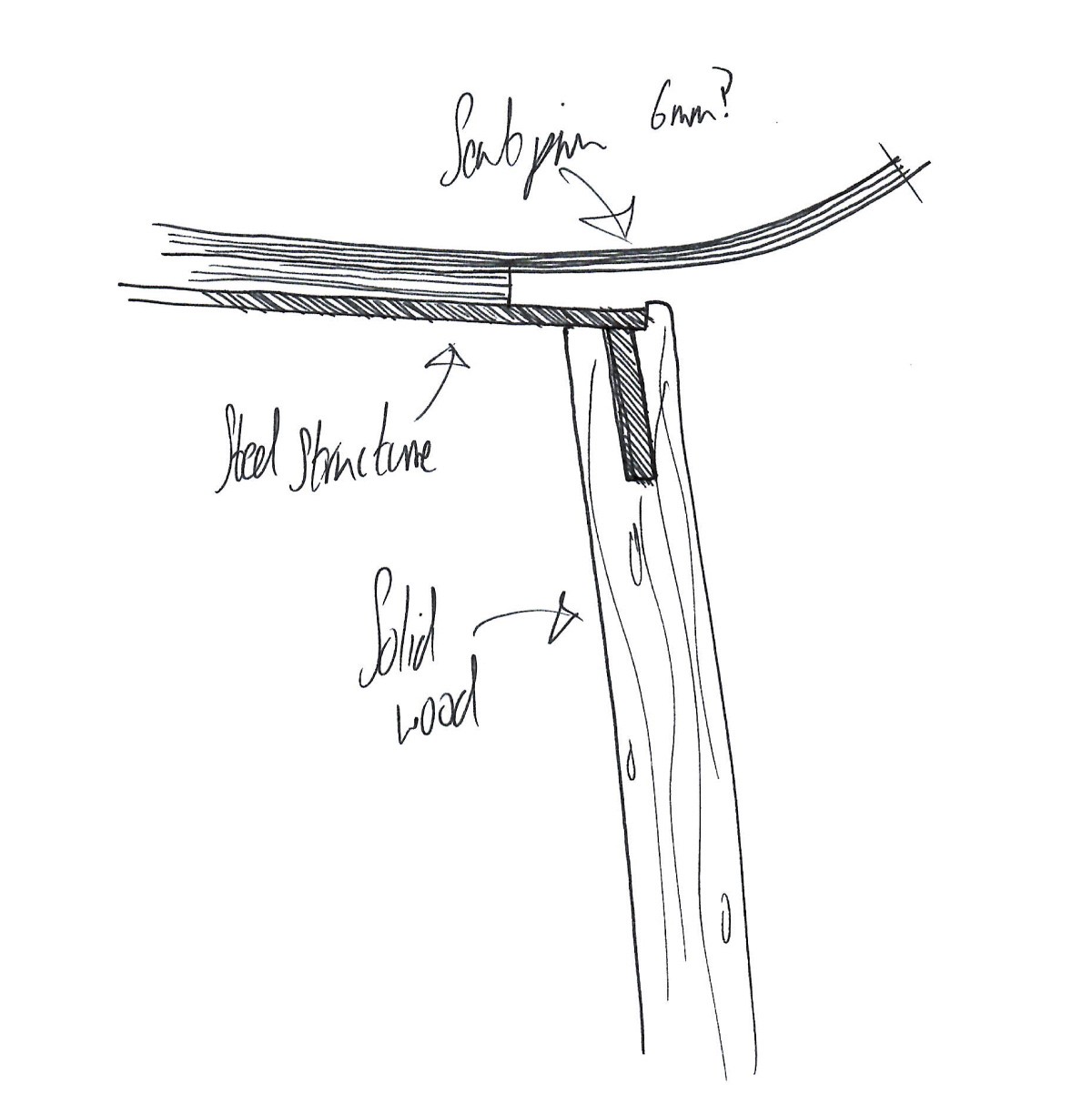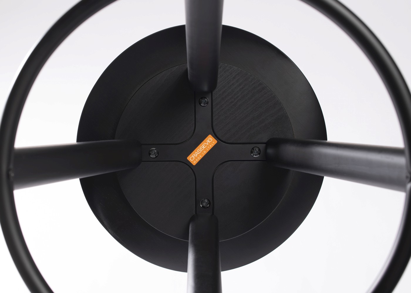 The sculptural seat pan is fixed to the base via an embedded cross shaped registration. This is connected to tapered solid wood legs all connected by simple tubular steel foot ring.
