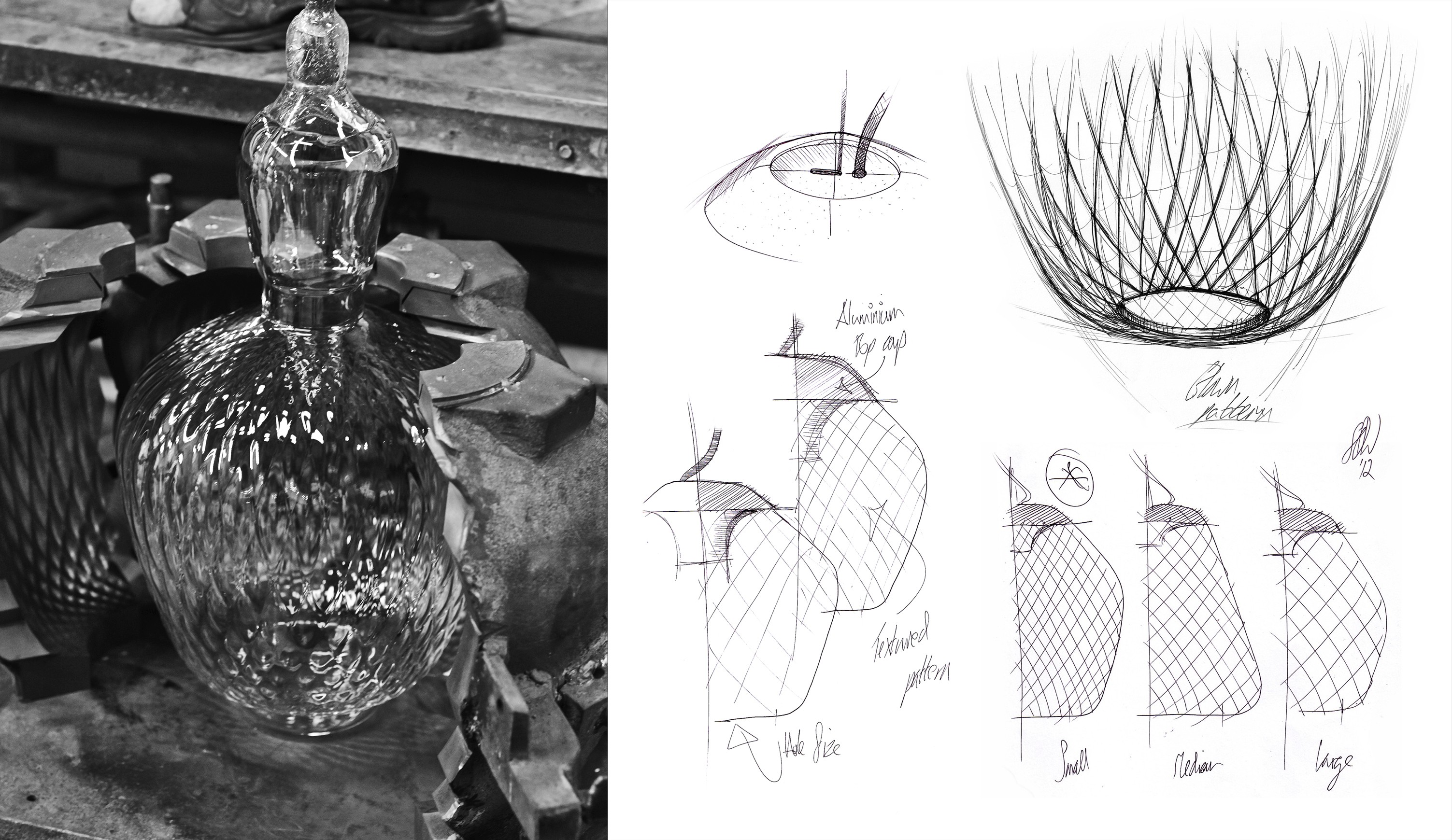 Blown experiments with the manufacturing process, combining industrial manufacture and hand-crafted finishing.
