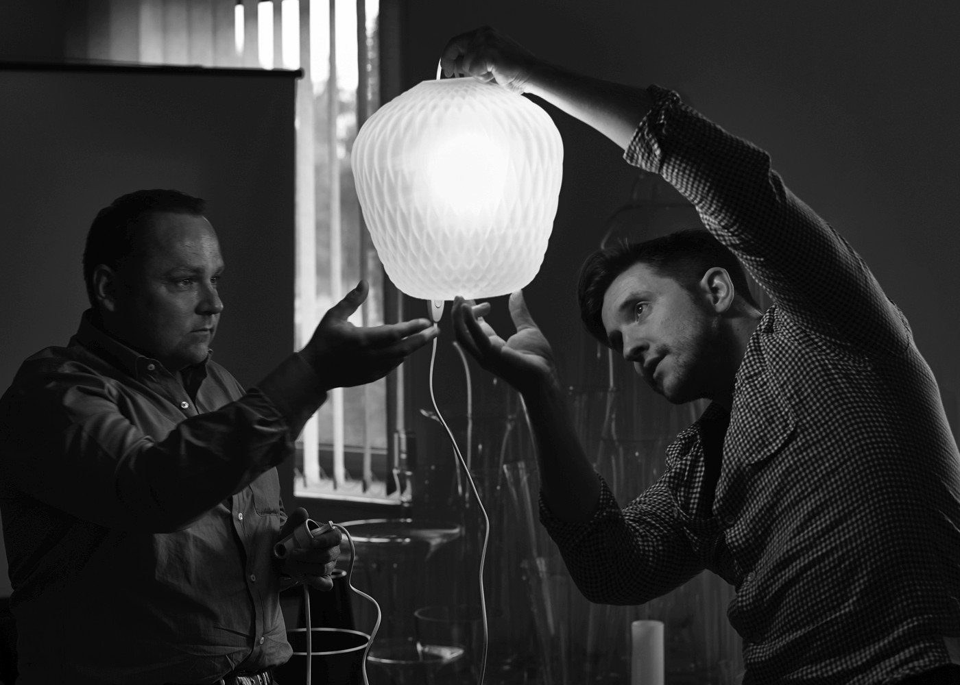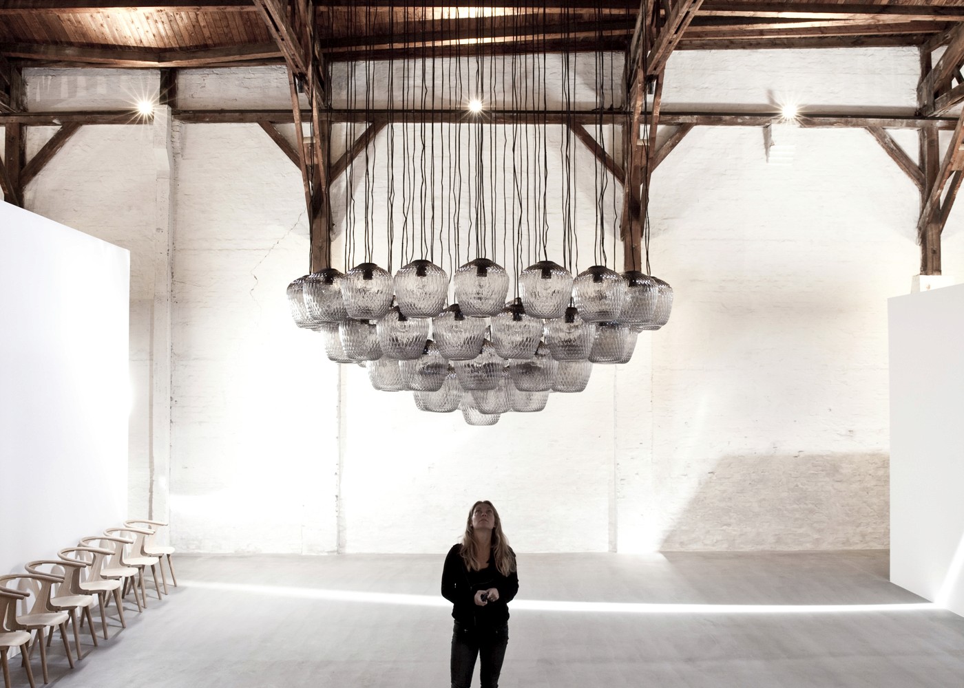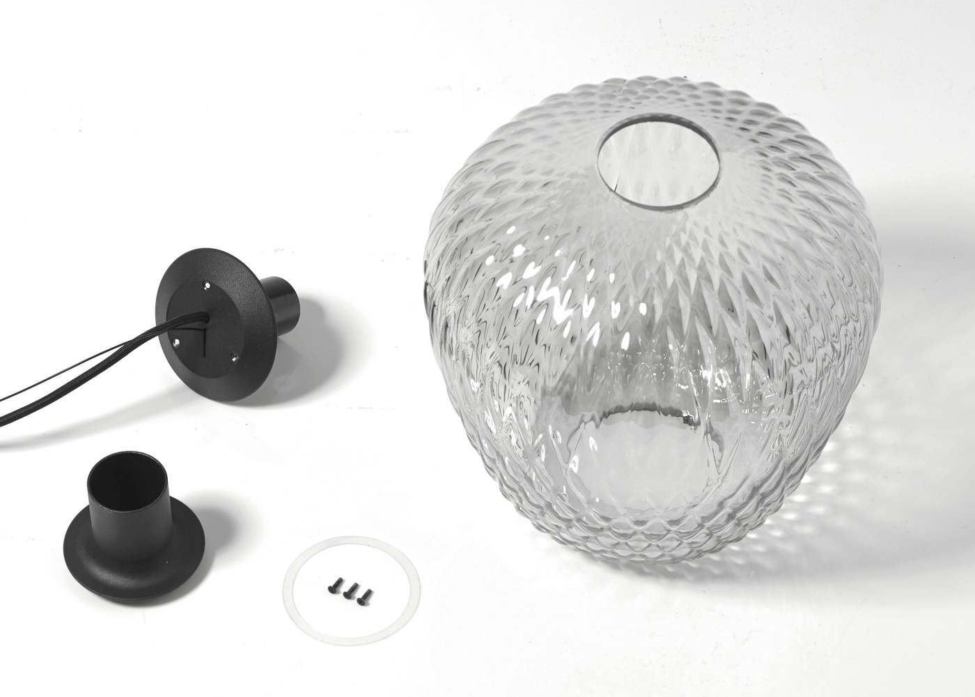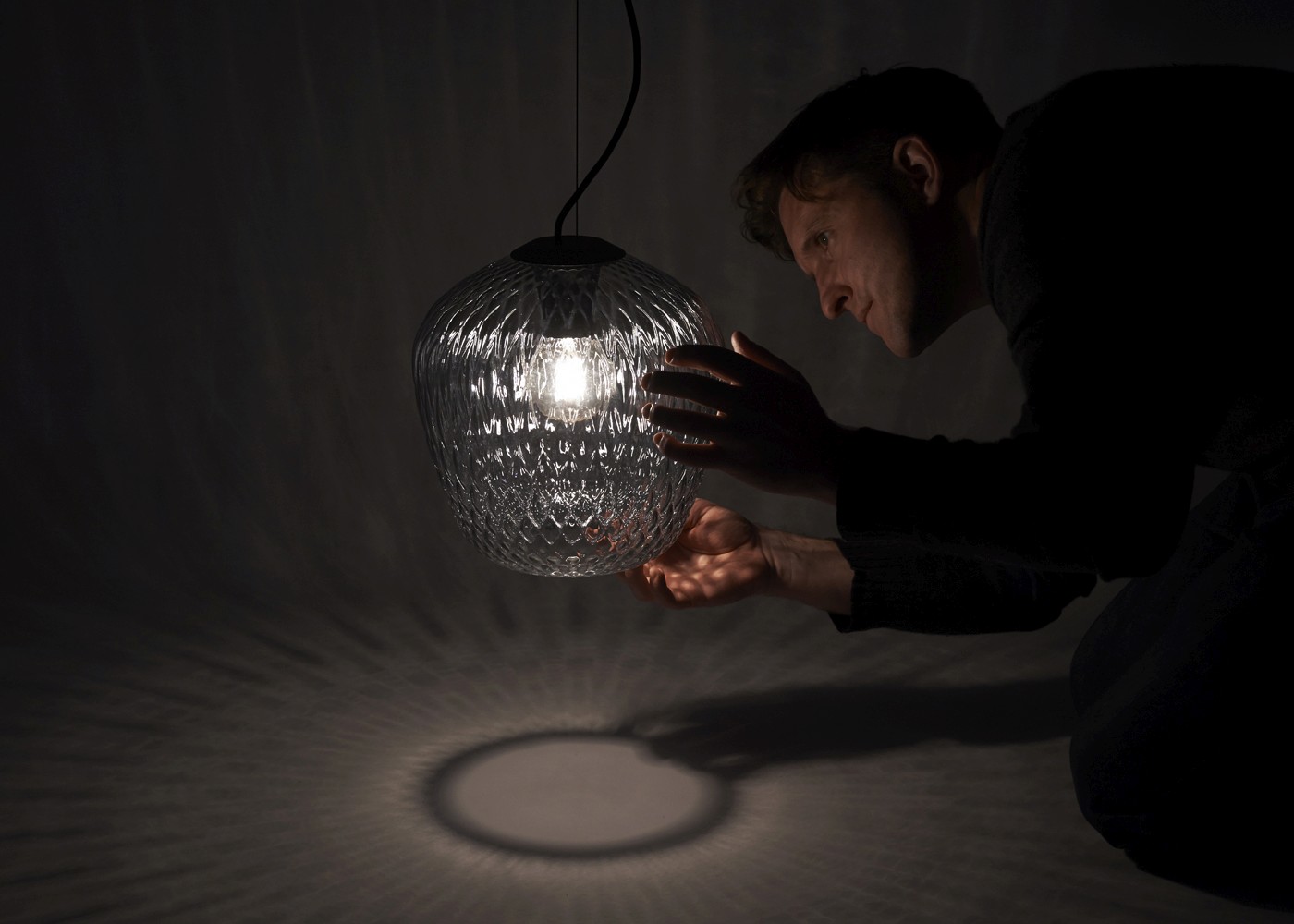The idea behind Blown is exploring reflection and refraction in glass, to design a textured volume that breaks up and reflects light. The lamp is a mouth-blown glass pendant light with a variegated lozenge pattern which encloses the light source.