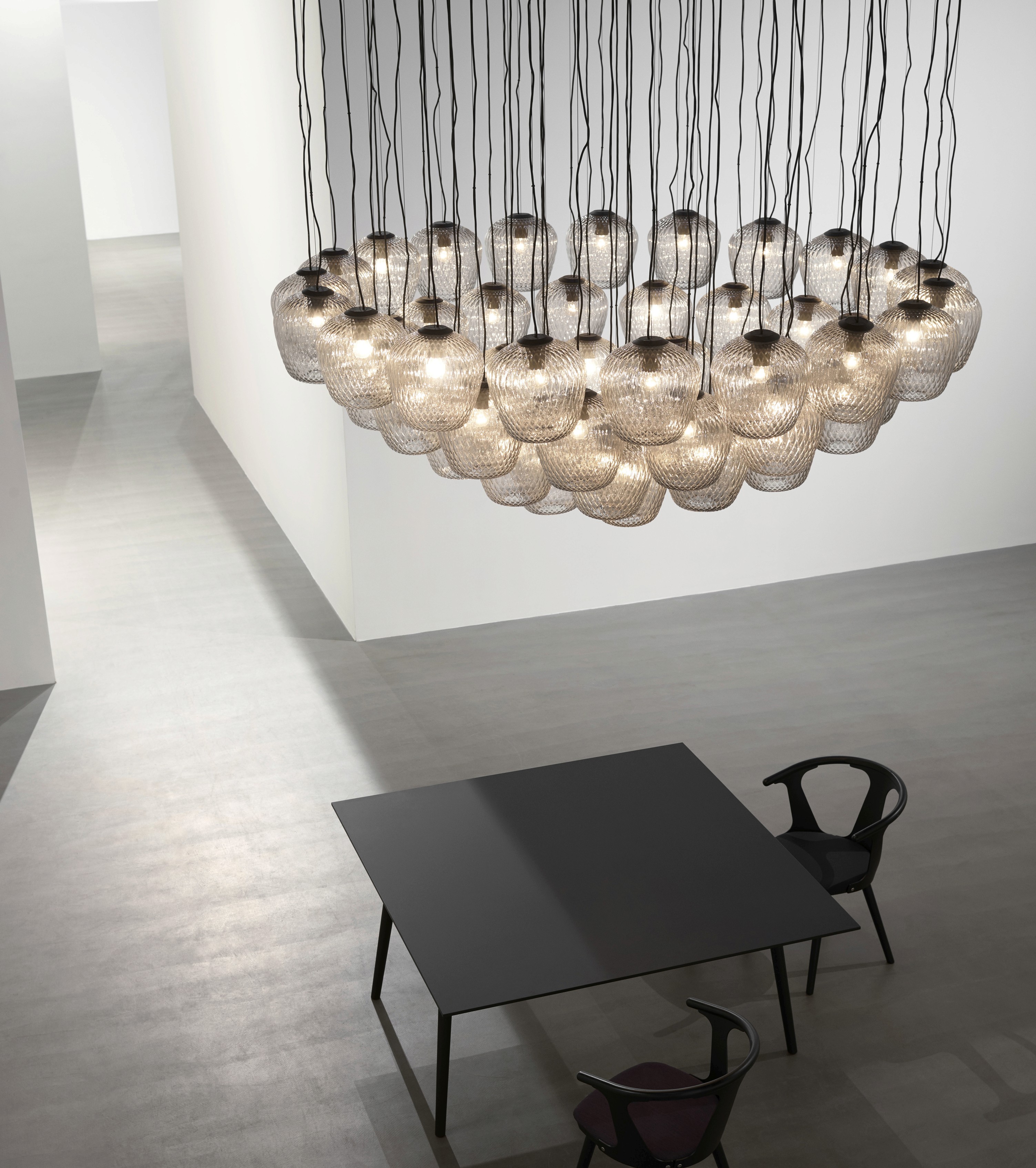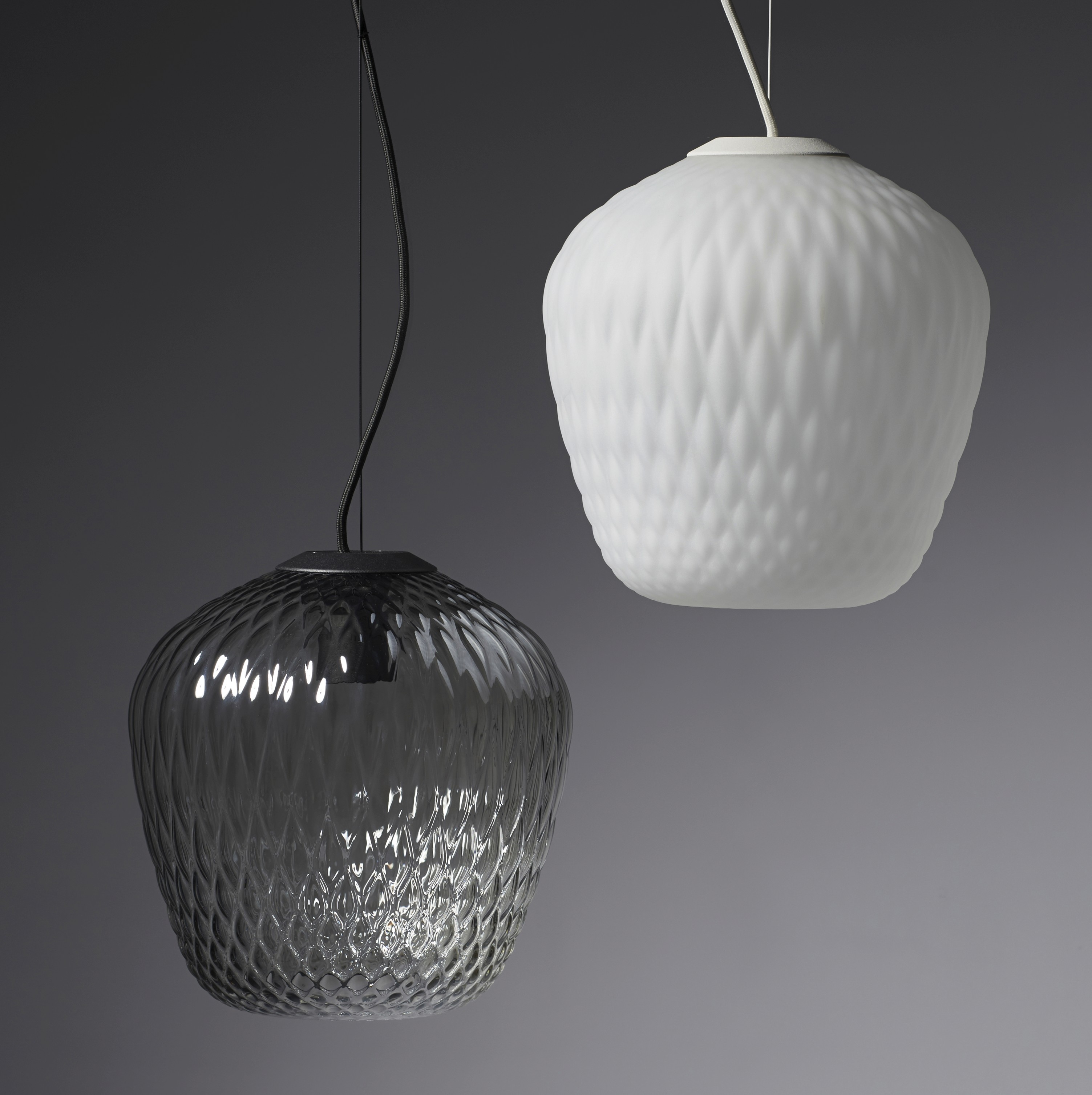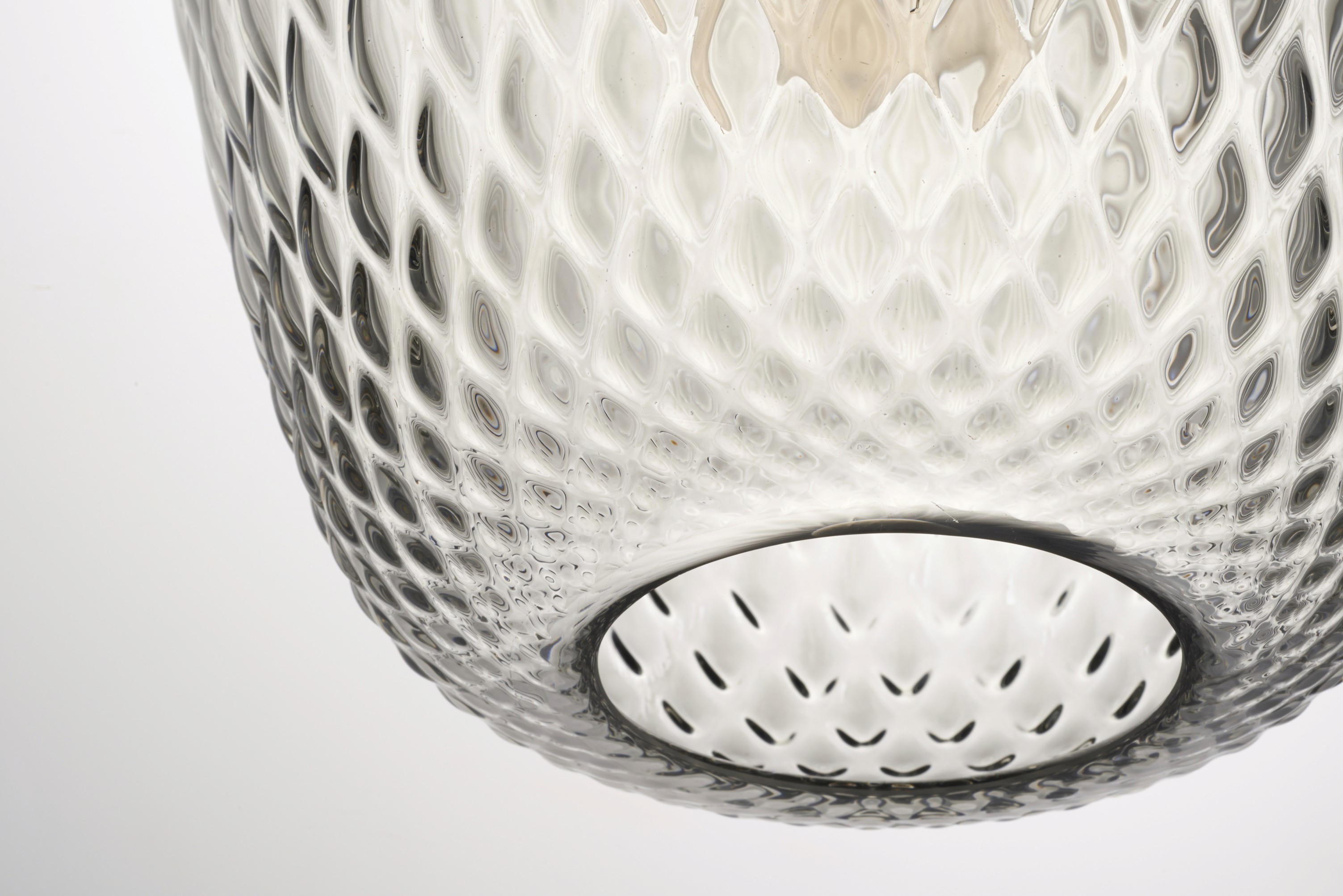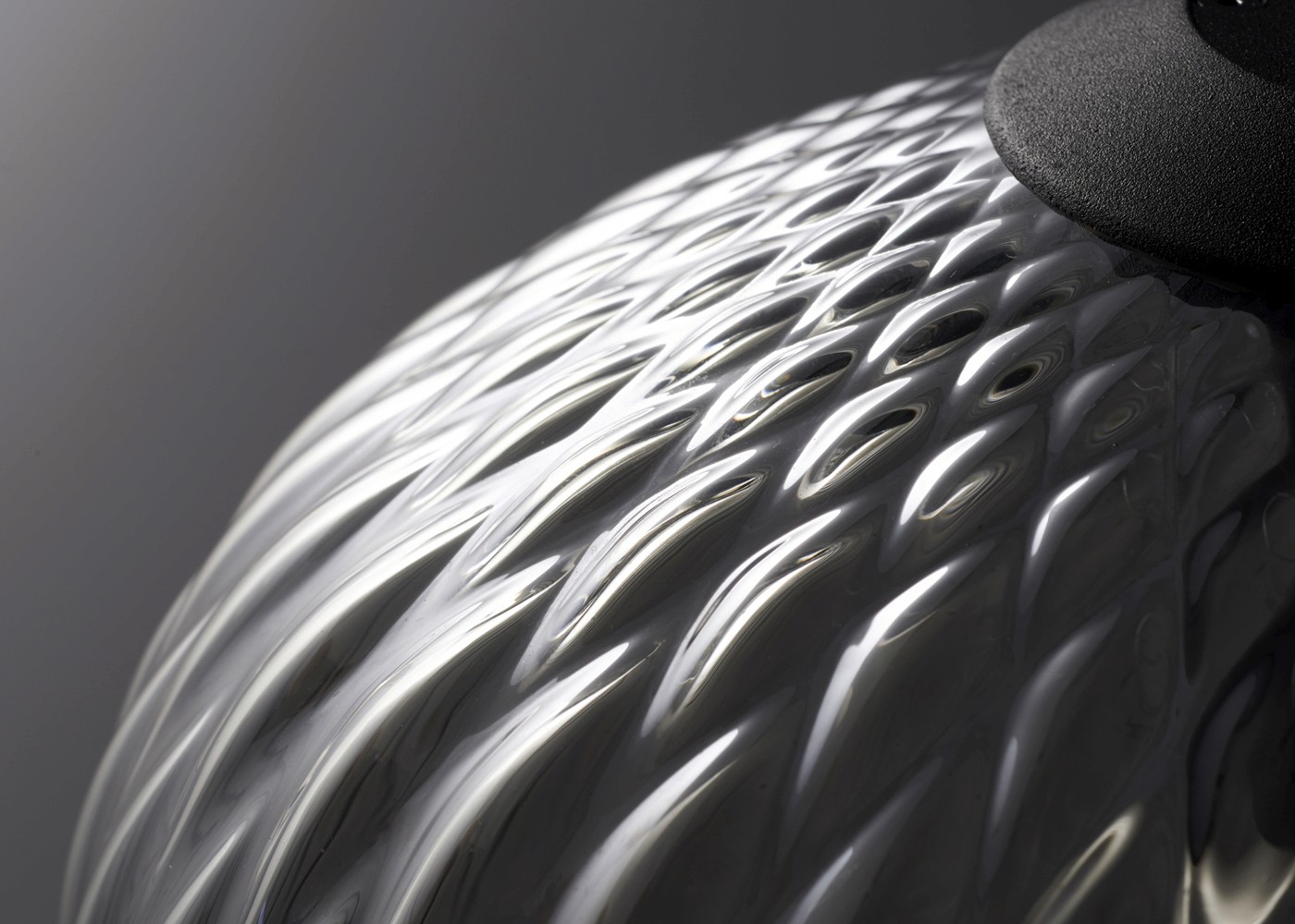 It comes in two versions: translucent with a silver lustre, and a sandblasted matte white. Both versions include a powder-coated die-cast aluminium suspension and fabric chord. The texture of the glass is rendered carefully with 3d CAD in order to control the inflation of each bubble, achieving fine control of how the form would reflect the light at different angles.