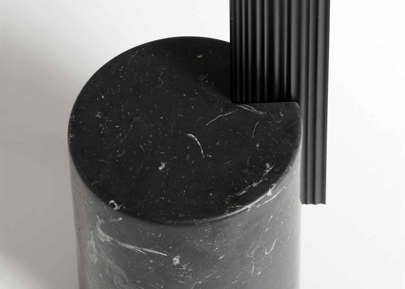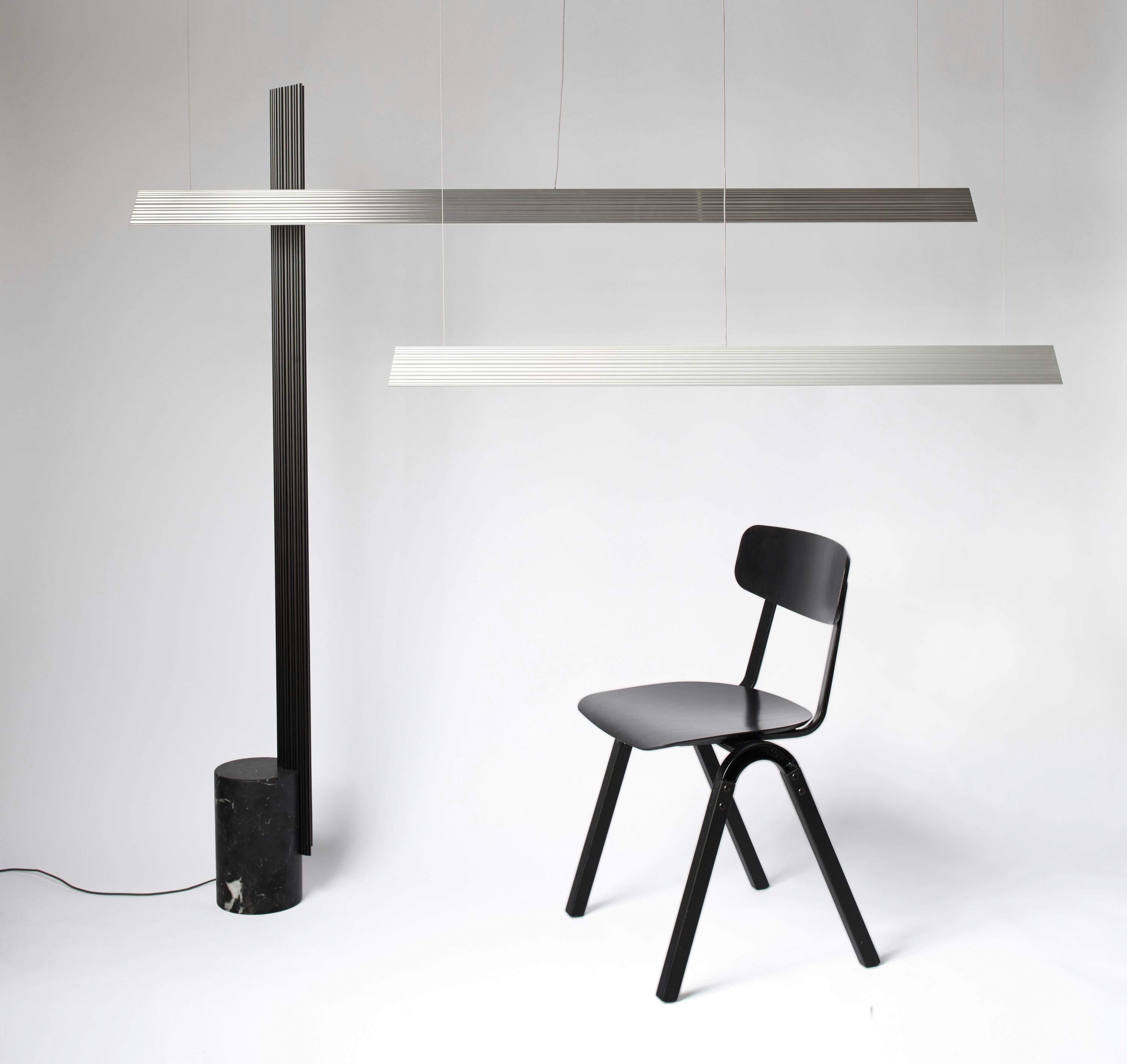 The extrusion is cleanly sliced with a small angle at each end and fitted with a diffuser that is recessed away from the edge promoting the extruded method of production. It can be hung horizontally as a pendant or fitted onto a circular marble base to work vertically.