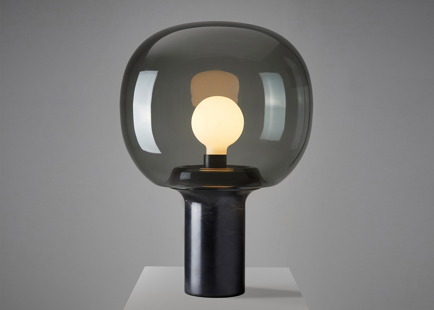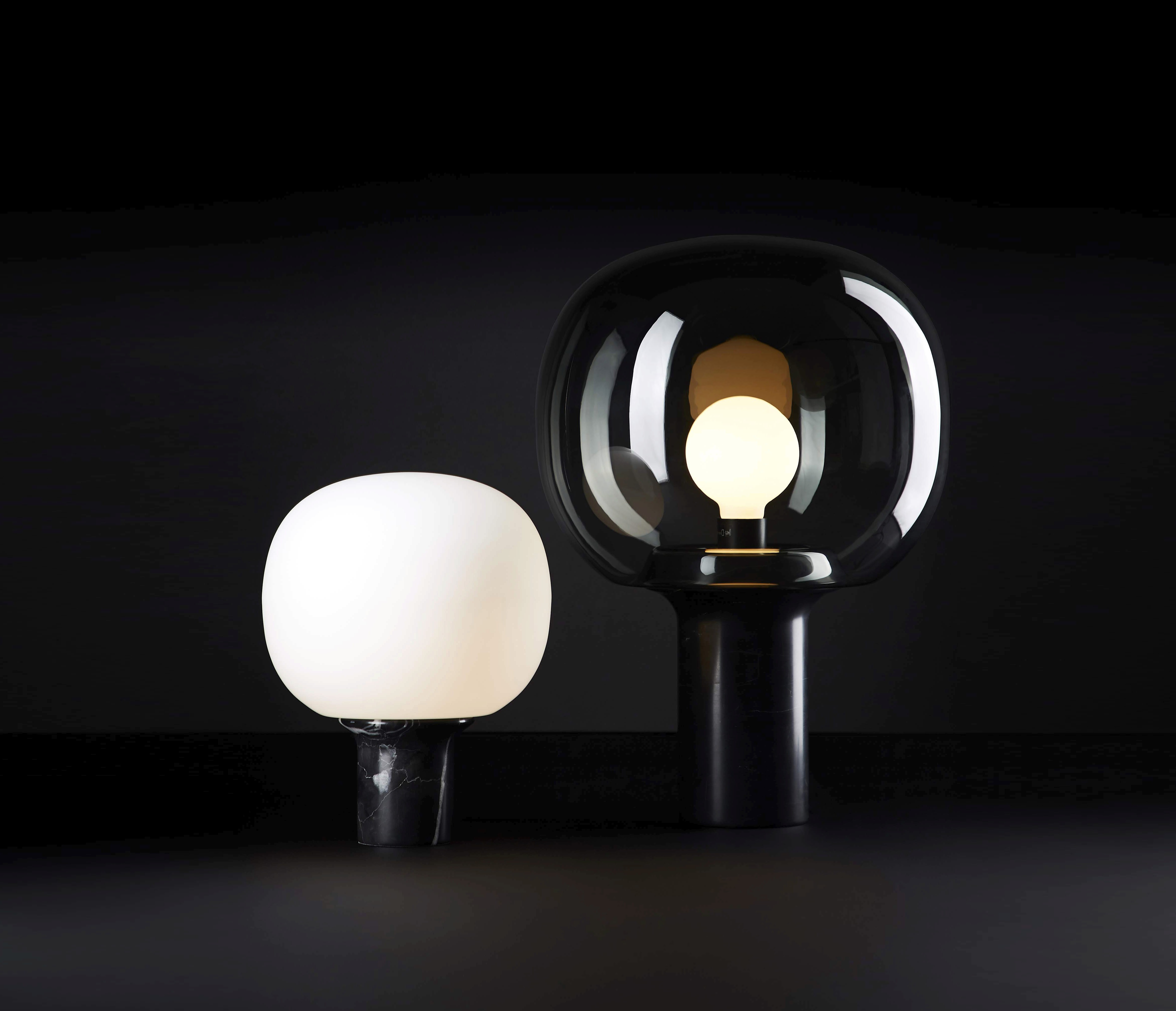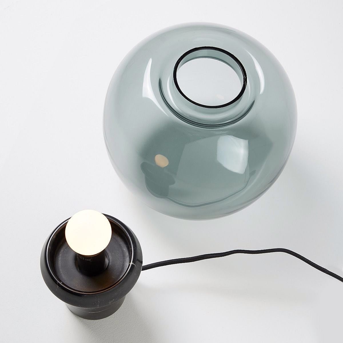 The signature detail is the junction between shade and base. The glass is blown with a unique profile to match the angle of the base so to simplify the connection, removing any need for extra screws or glue. This detail creates the vision of the glass flowing up and around the collar then disappearing down into the base.