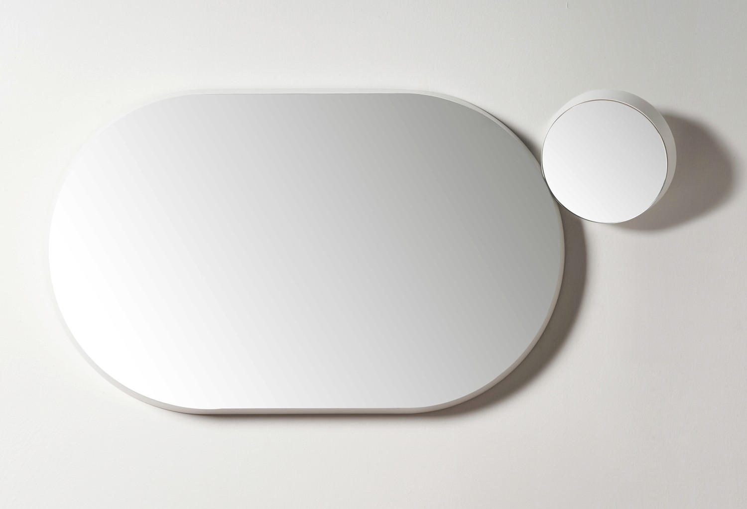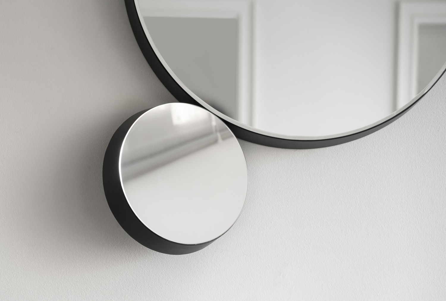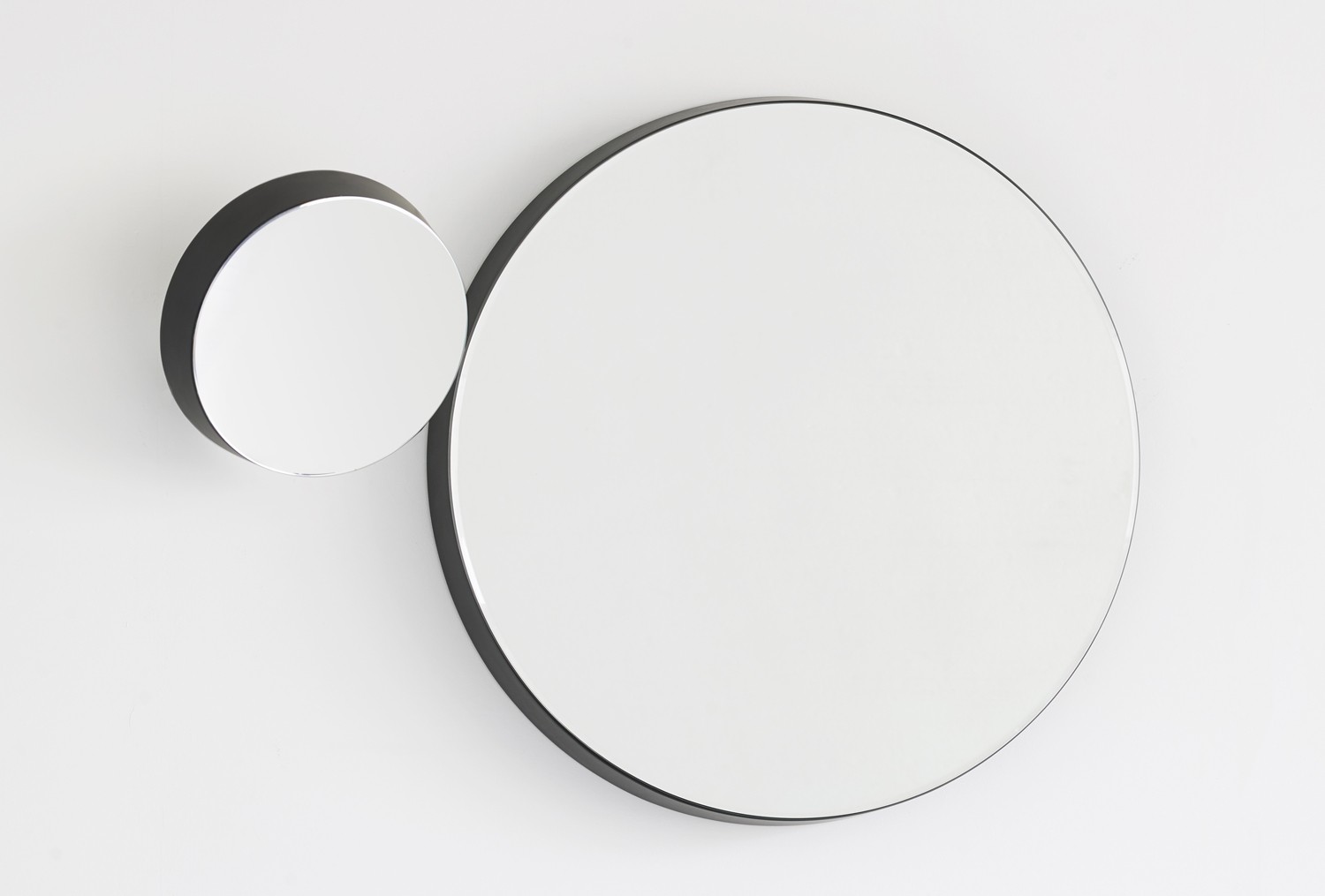 Gravity is a playful double mirror whose geometric elements magically appear to be drawn together, like two planets pull together by gravity. The larger geometric oval mirror has a thick angled rim that can be hung portrait or landscape.The second smaller magnified round mirror points back toward the user and can be detached or placed around the edge as desired by the user. The main mirror is available in two forms, oval and round.