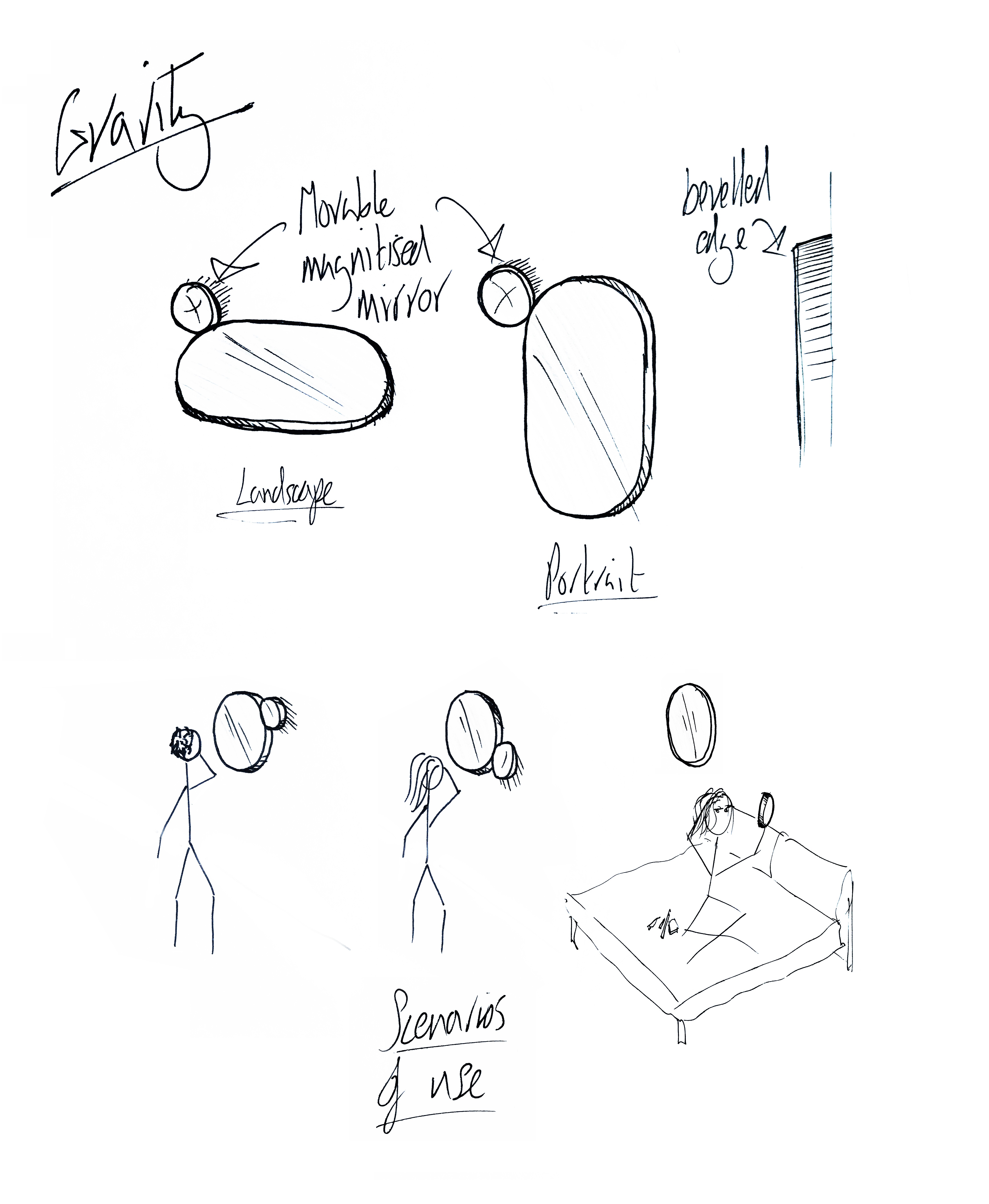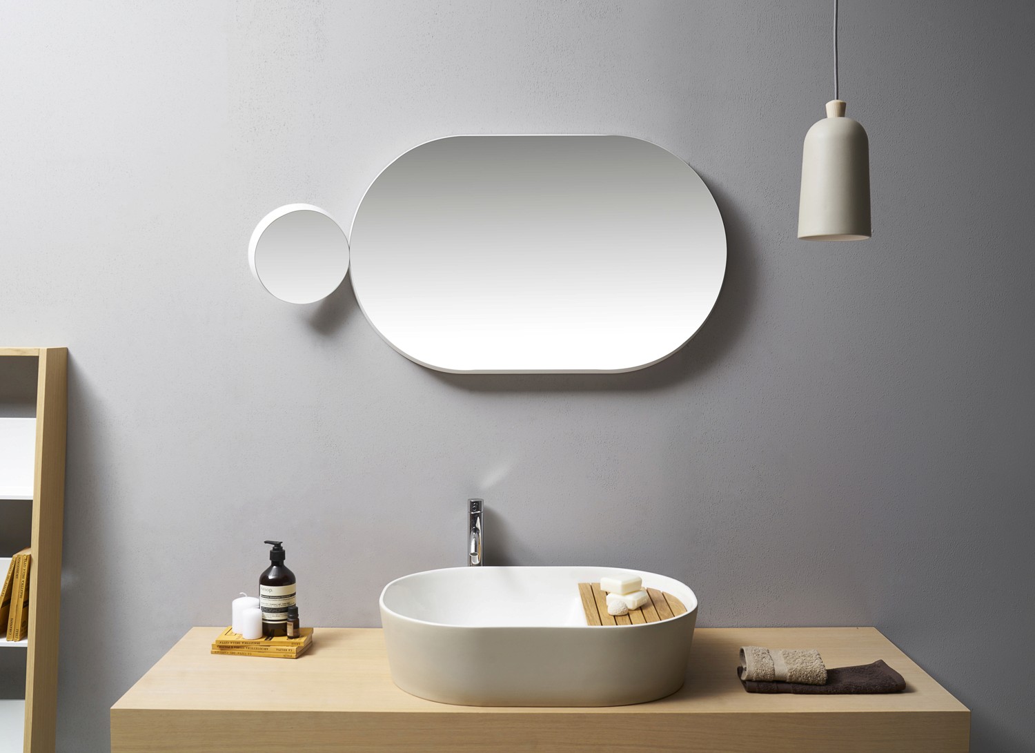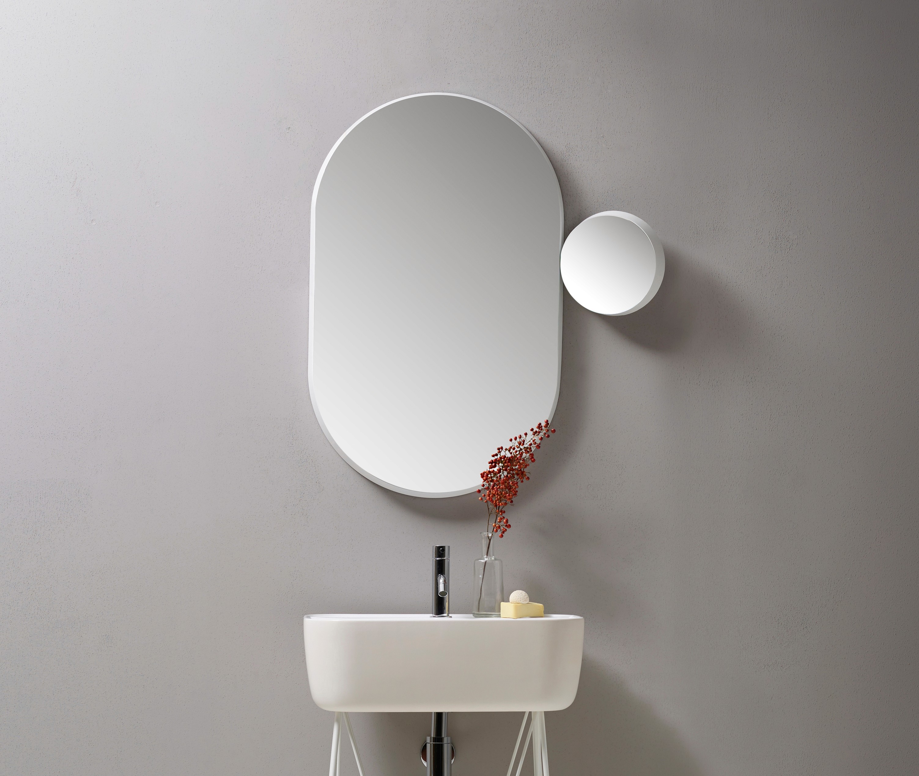 Gravity is a playful double mirror whose geometric elements magically appear to be drawn together, like two planets pull together by gravity. The larger geometric oval mirror has a thick angled rim that can be hung portrait or landscape.The second smaller magnified round mirror points back toward the user and can be detached or placed around the edge as desired by the user. The main mirror is available in two forms, oval and round.