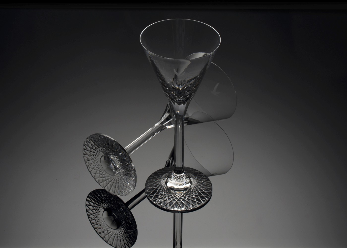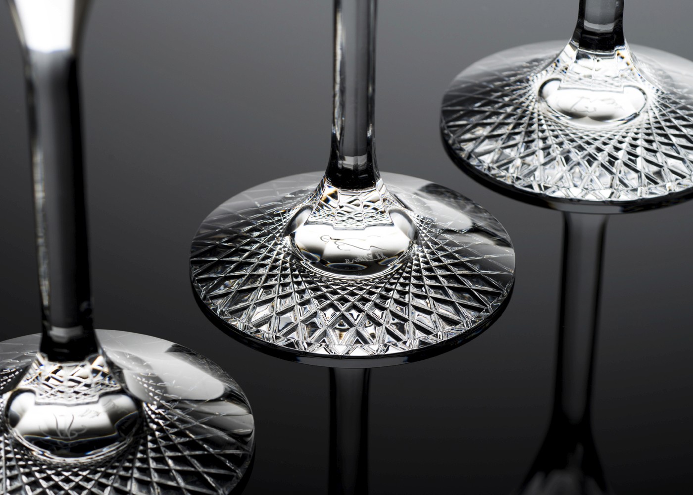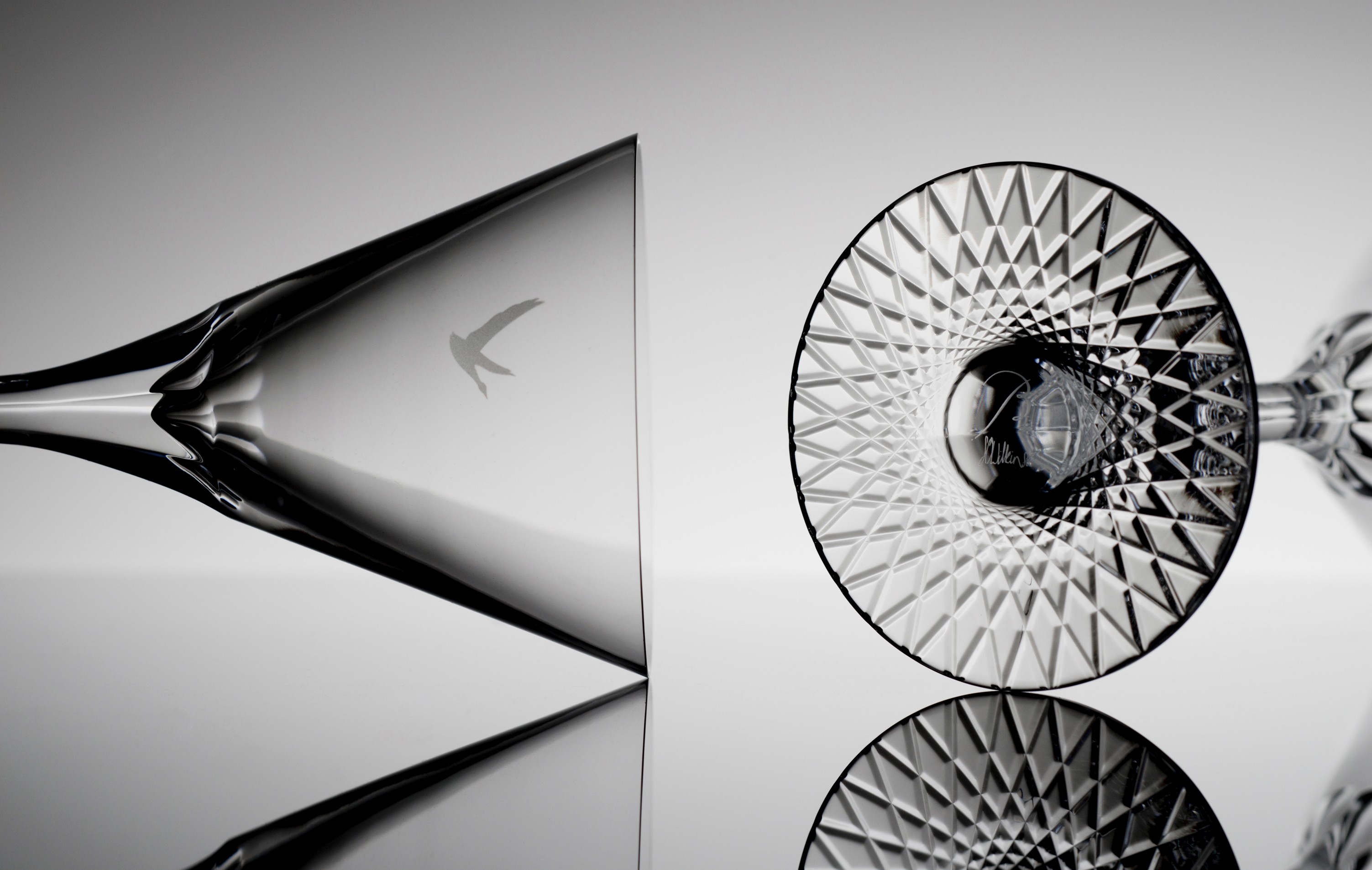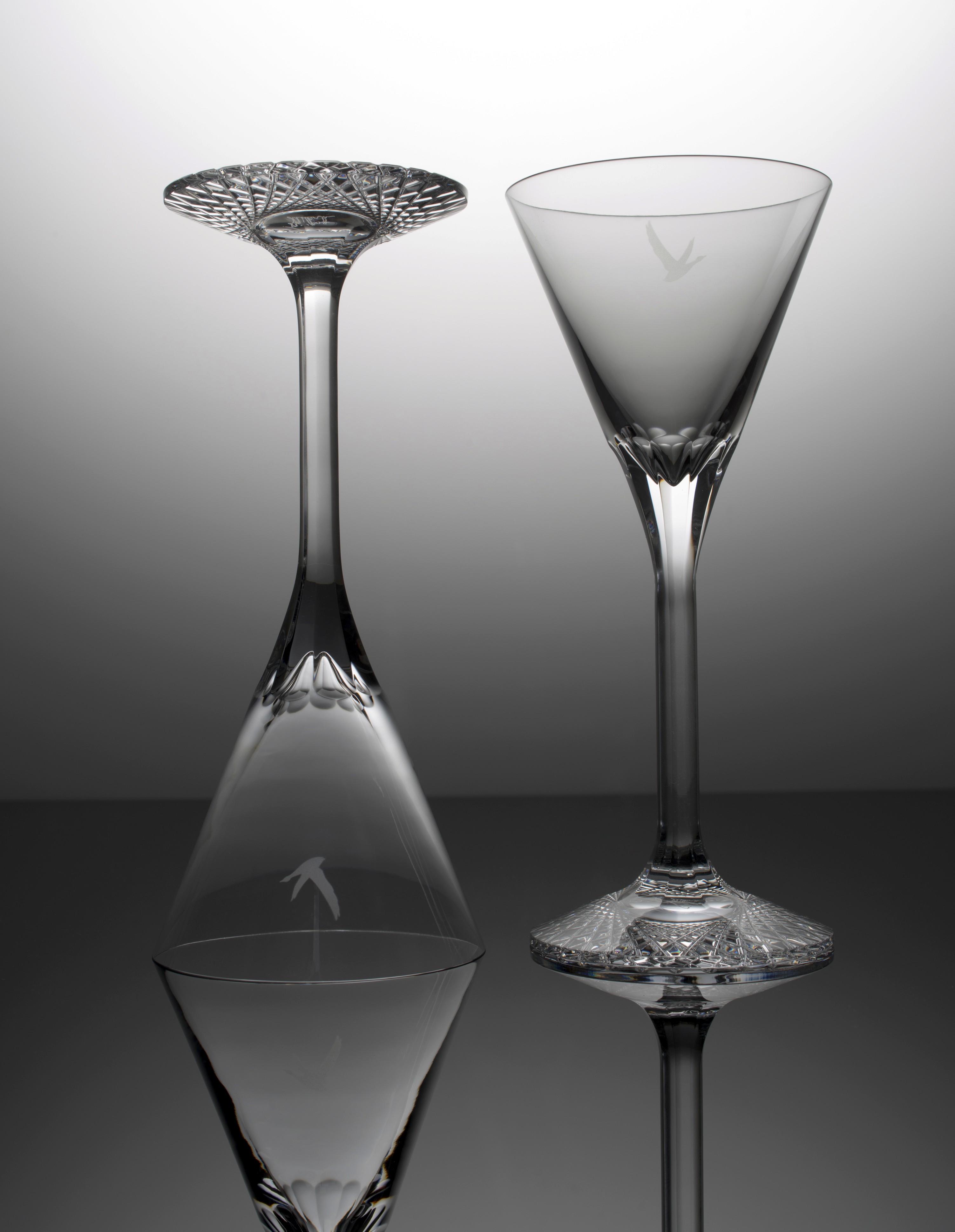 The new glass has a contemporary minimal aesthetic of two canonical forms connected by a fluid stem. The design also features a solid crystal base that magnifies an intricate guilloché pattern hand cut into the base, while the other signature detail are nine facets that flow from the top of base up to the parison. The quality of these details show off Baccarat’s superior skill and set it well apart from any standard glass.