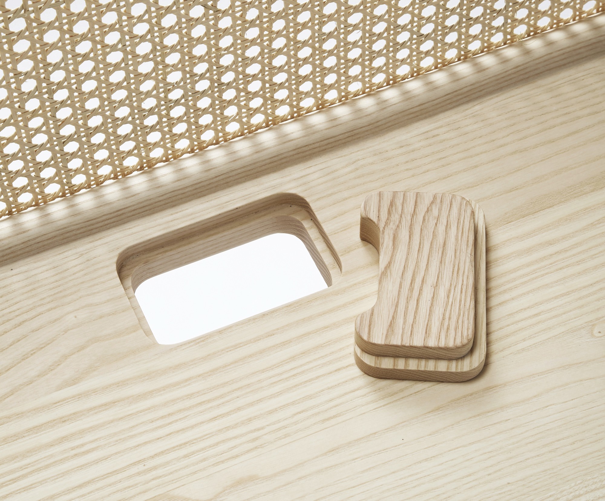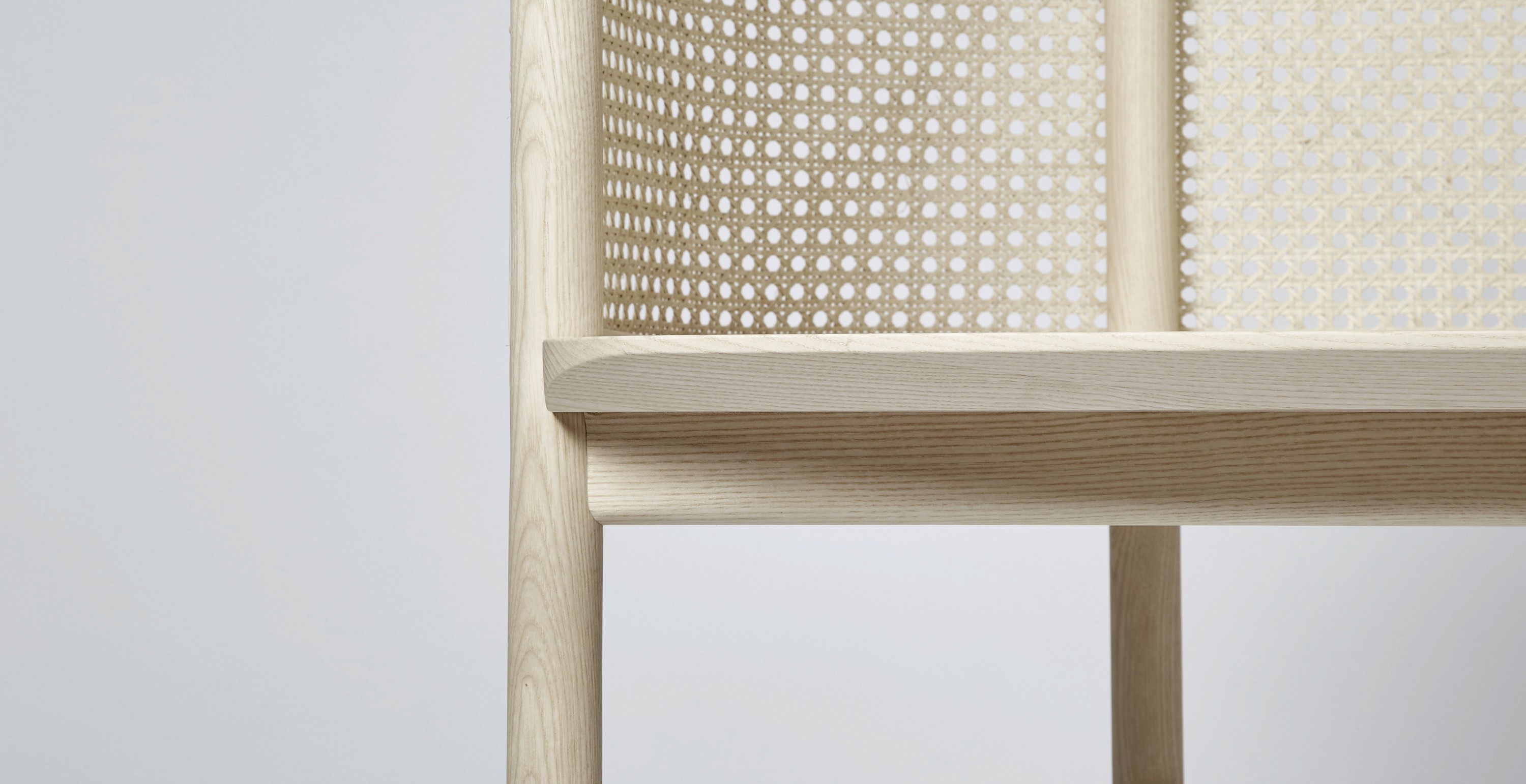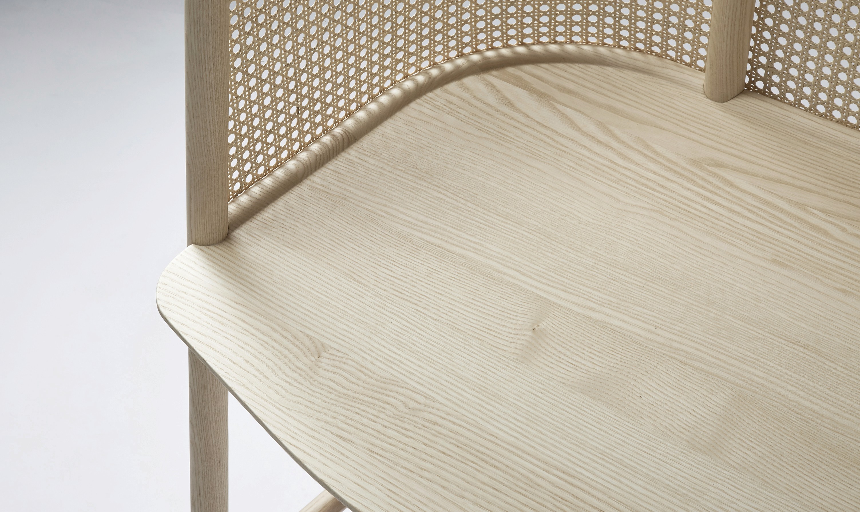 The desks structure, like the chair, has a signature curving line that connects the front legs via a wooden rail that sweeps up and across the top of the screen. The structure is completed by the connected rear leg dowel and lower cross bar that all get pinned by a solid ash surface. The piece isstrong yet still lightweight. At the back of the surface is a useful wooden plug for cable management.