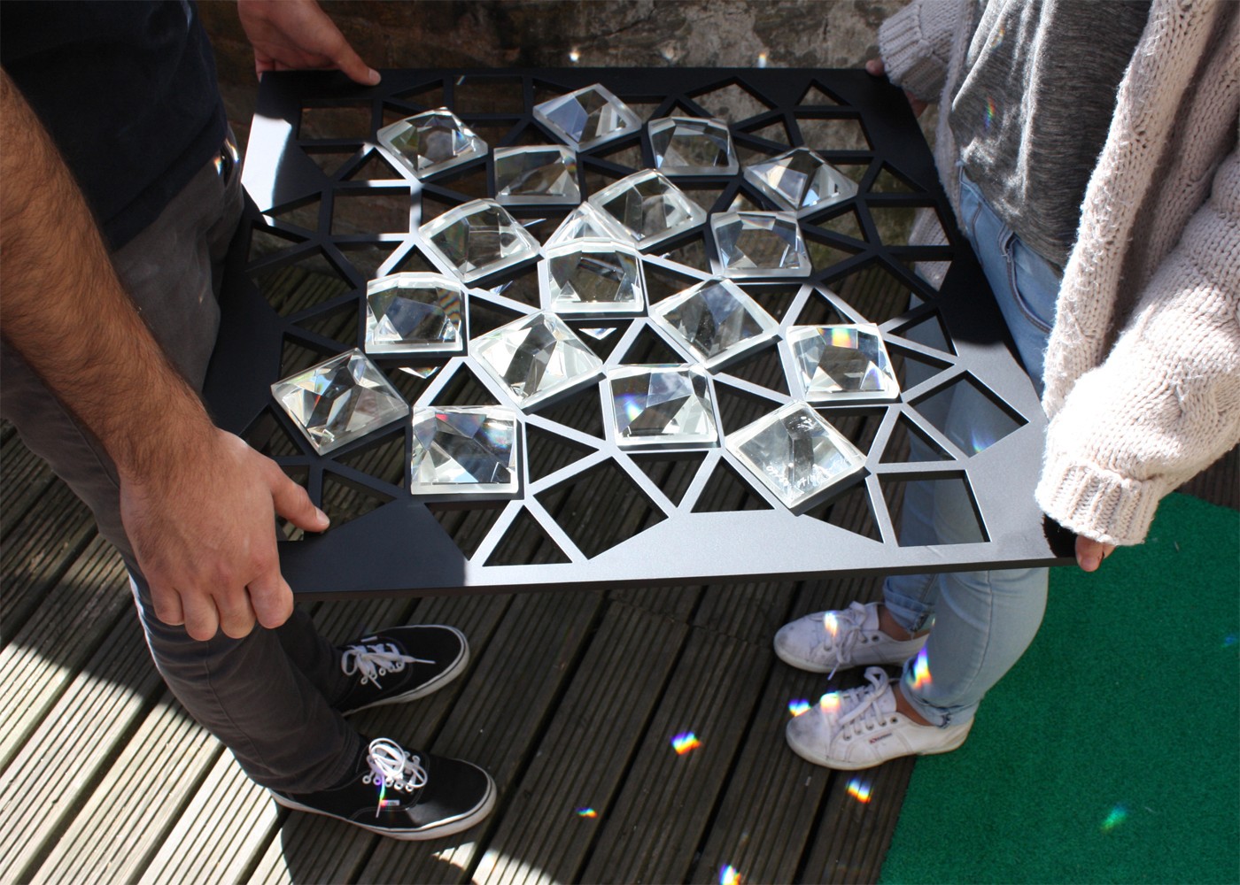 Drawing a parallel between the fragmented nature of the digital world, with its kaleidoscope of different perspectives, and the refractive behaviour of prisms, the Ommatidium’s giant, multifaceted lens canopy turns sunlight into an ever-changing display of rainbows on the pavement below. At night the canopy is powered by low energy lights that change the installation into a gleaming beacon on Old Street.