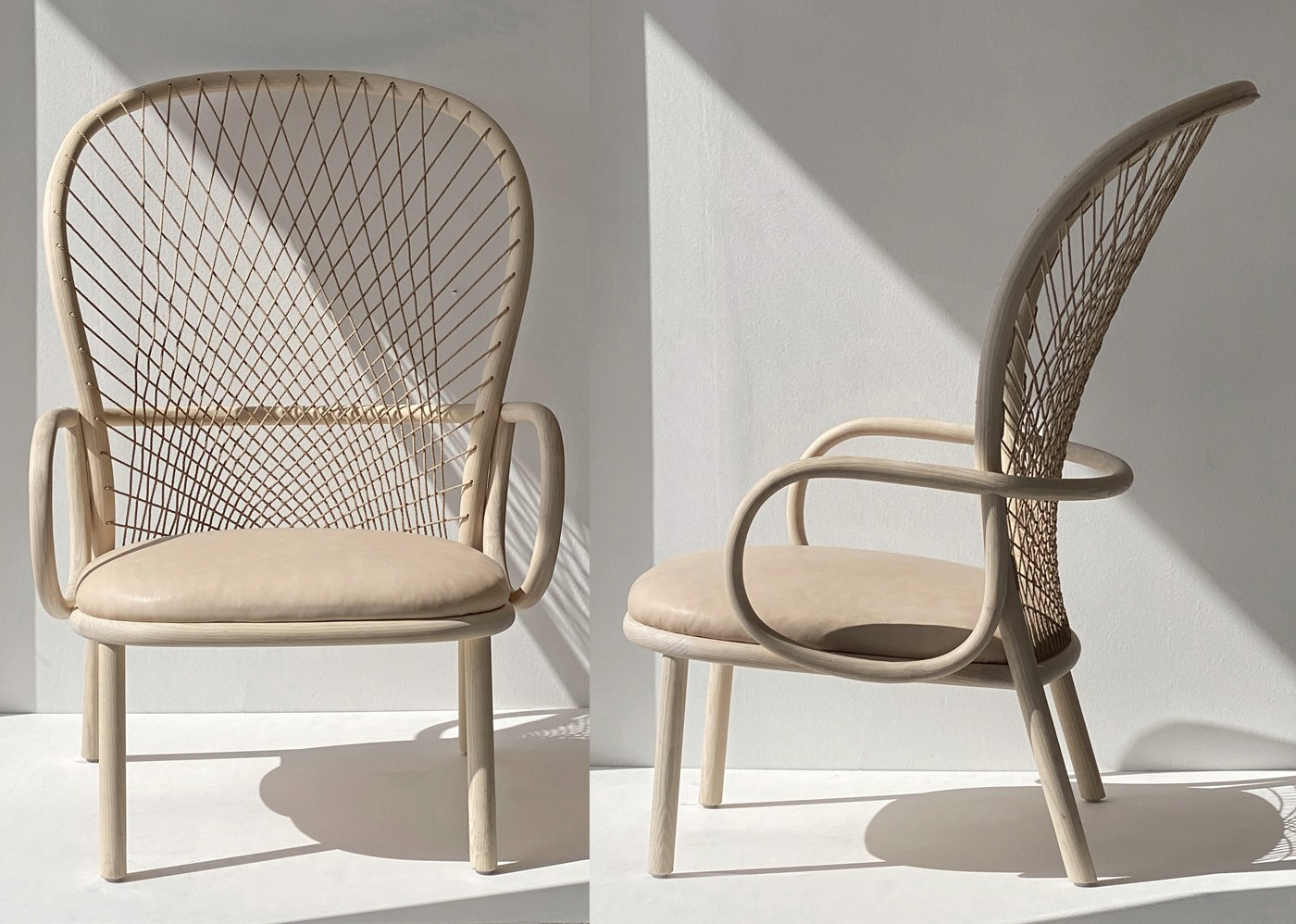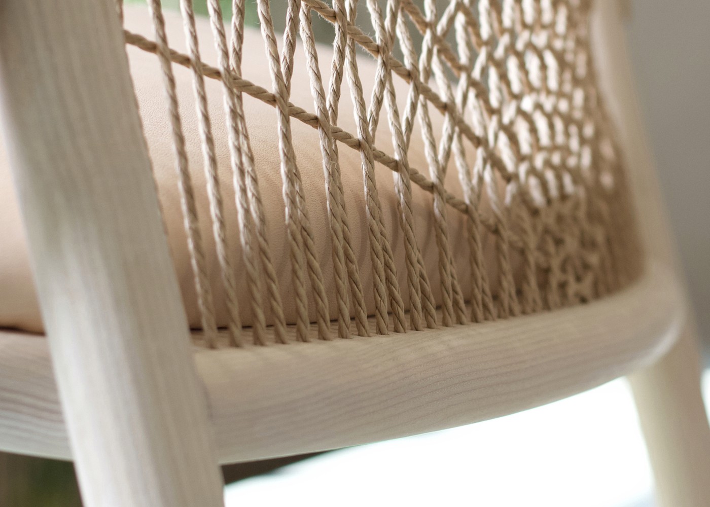 The chair consists of two curved elements of steam bent timber pinned together by an solid wood seat frame. A sprung backrest is created from paper twine neatly weaved back and forth across the curved form. The open weave provides great support while also giving a nod to Gemla’s early history of manufacturing Tennis racquets, hence the name Gemla OPEN.