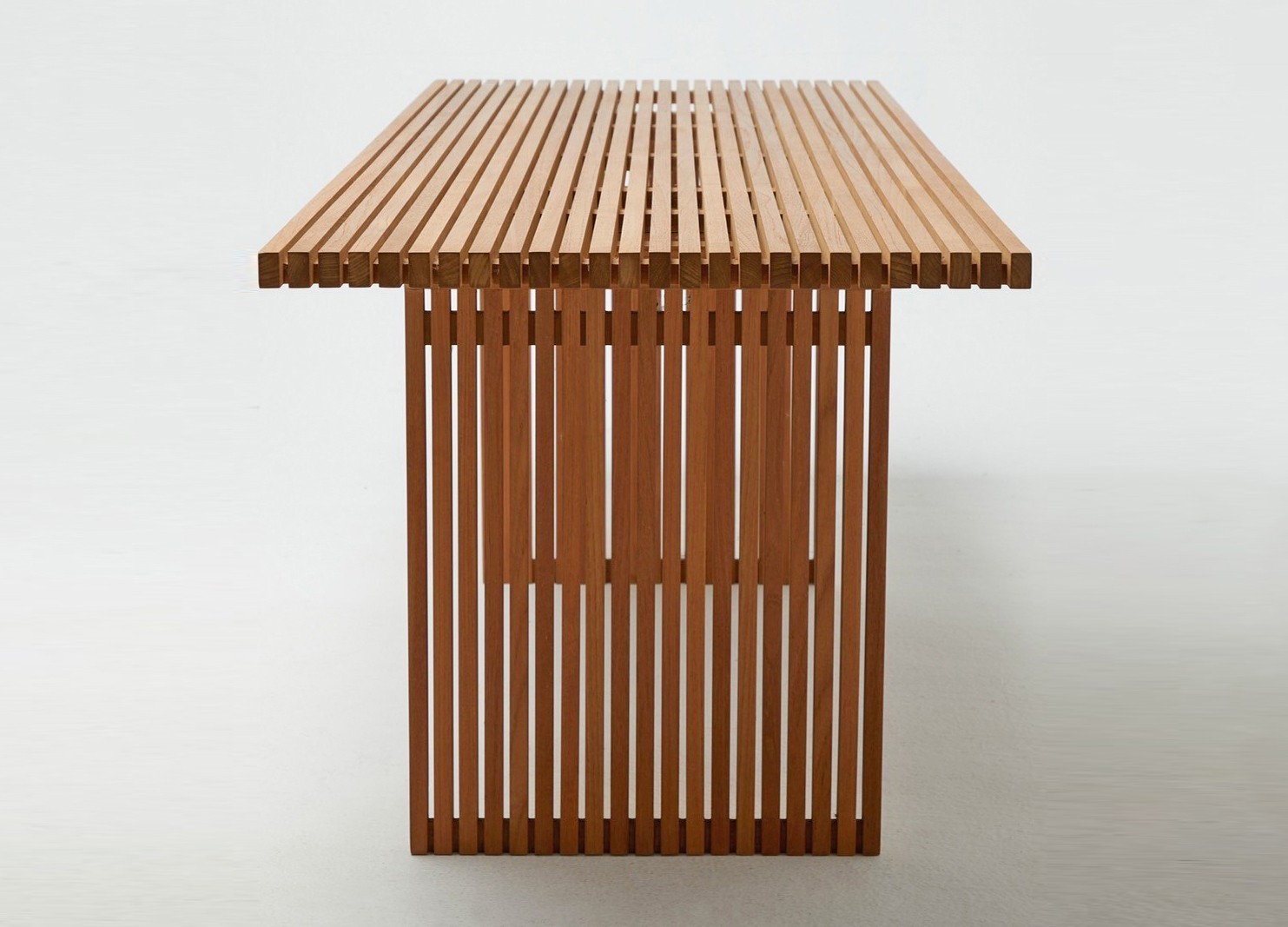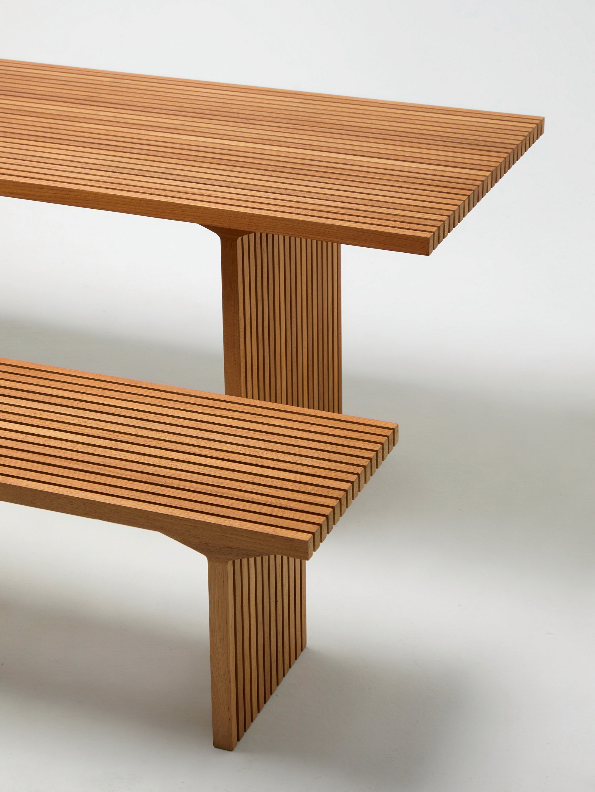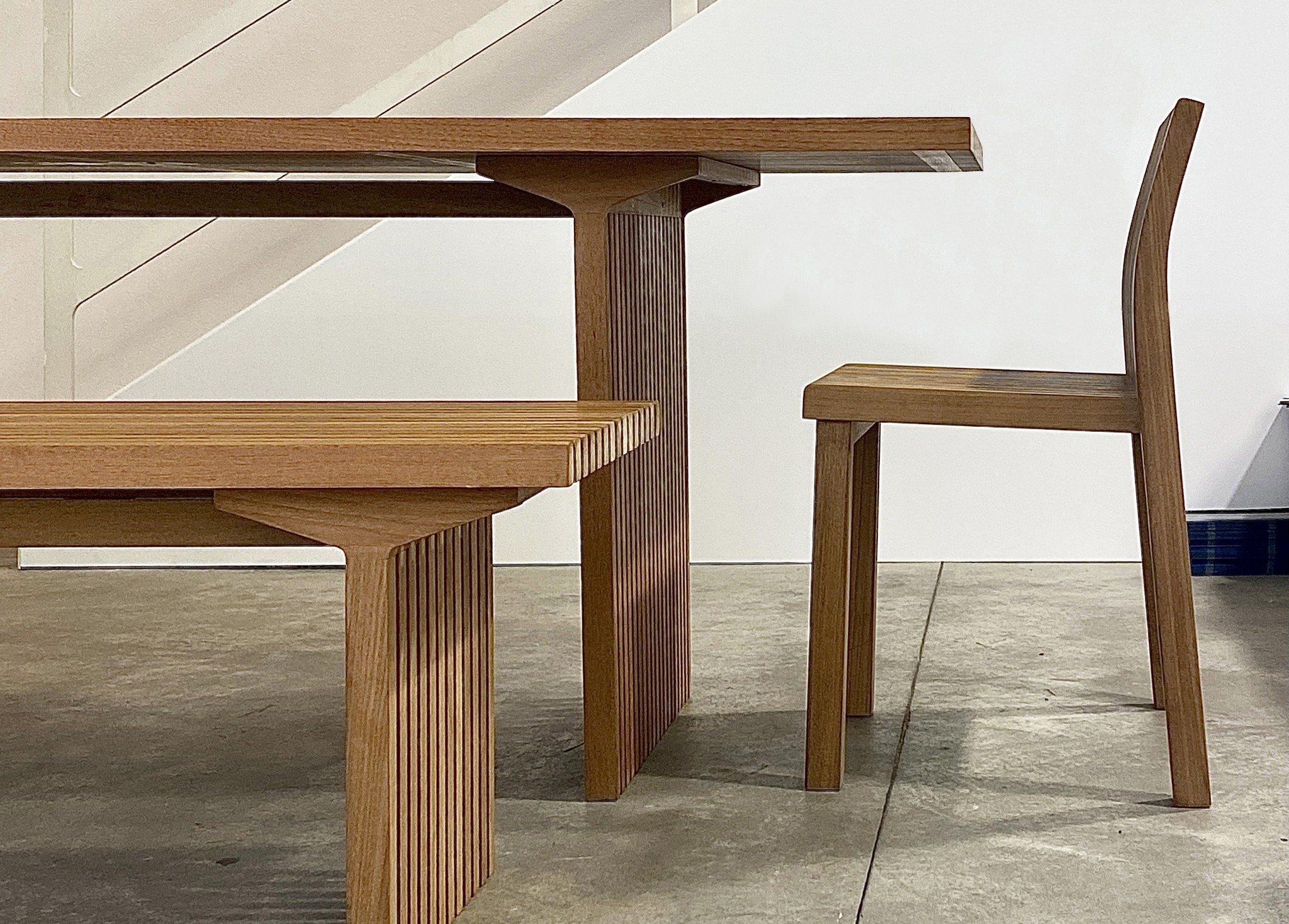 Parallel is a sculptural series of furniture made from waste material of thin strips of solid Teak that were discarded in the factory. The series consists of a table, bench and chair. The collection will be shown for the first time as part of an exhibition called ‘Slow hand design’ at Superstudio during the Salone del mobile 2022 in Milan.