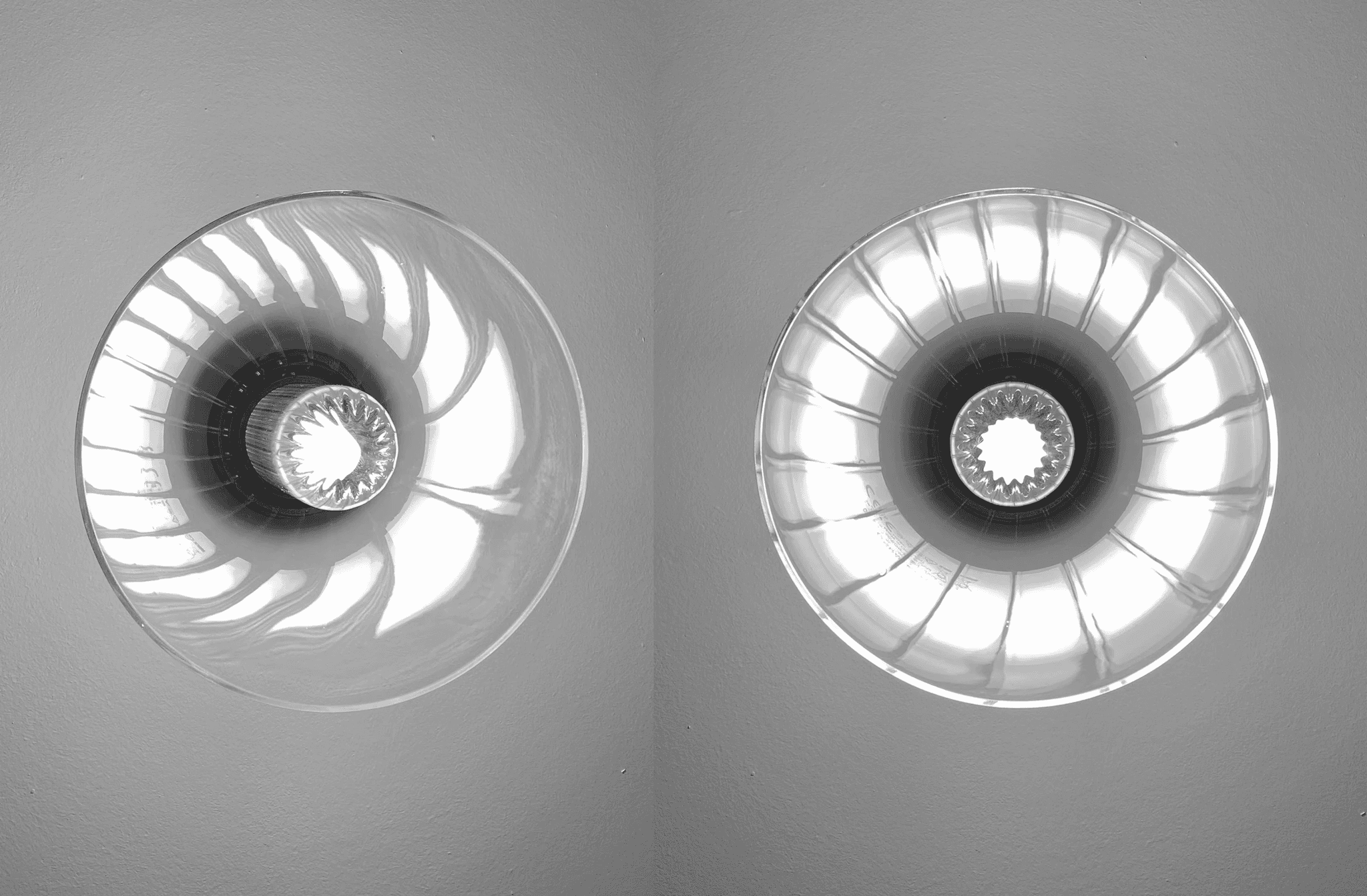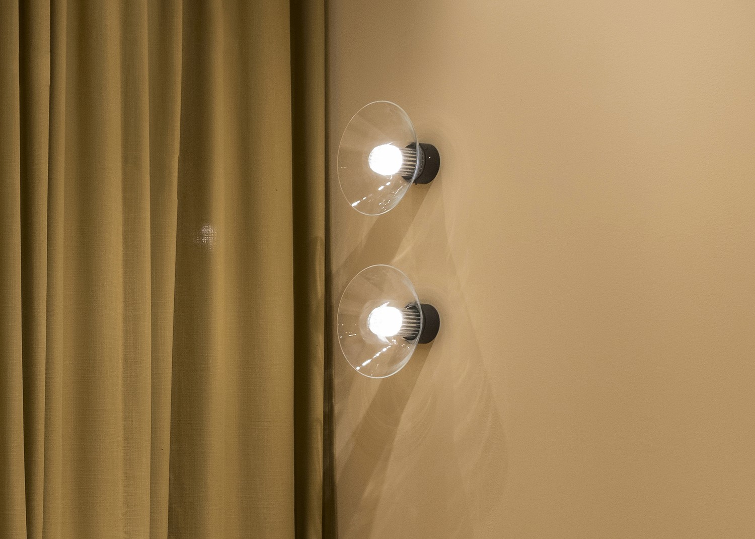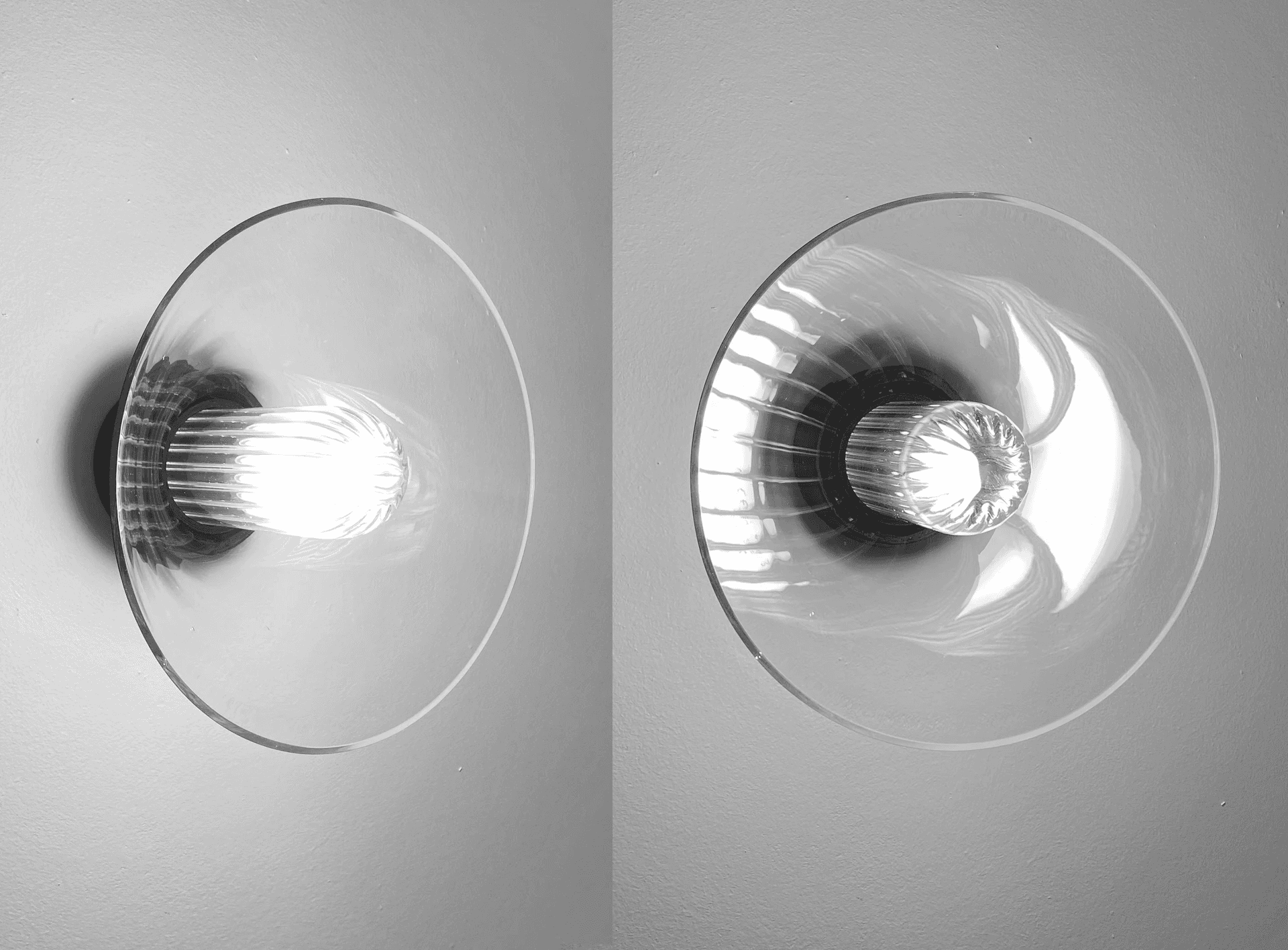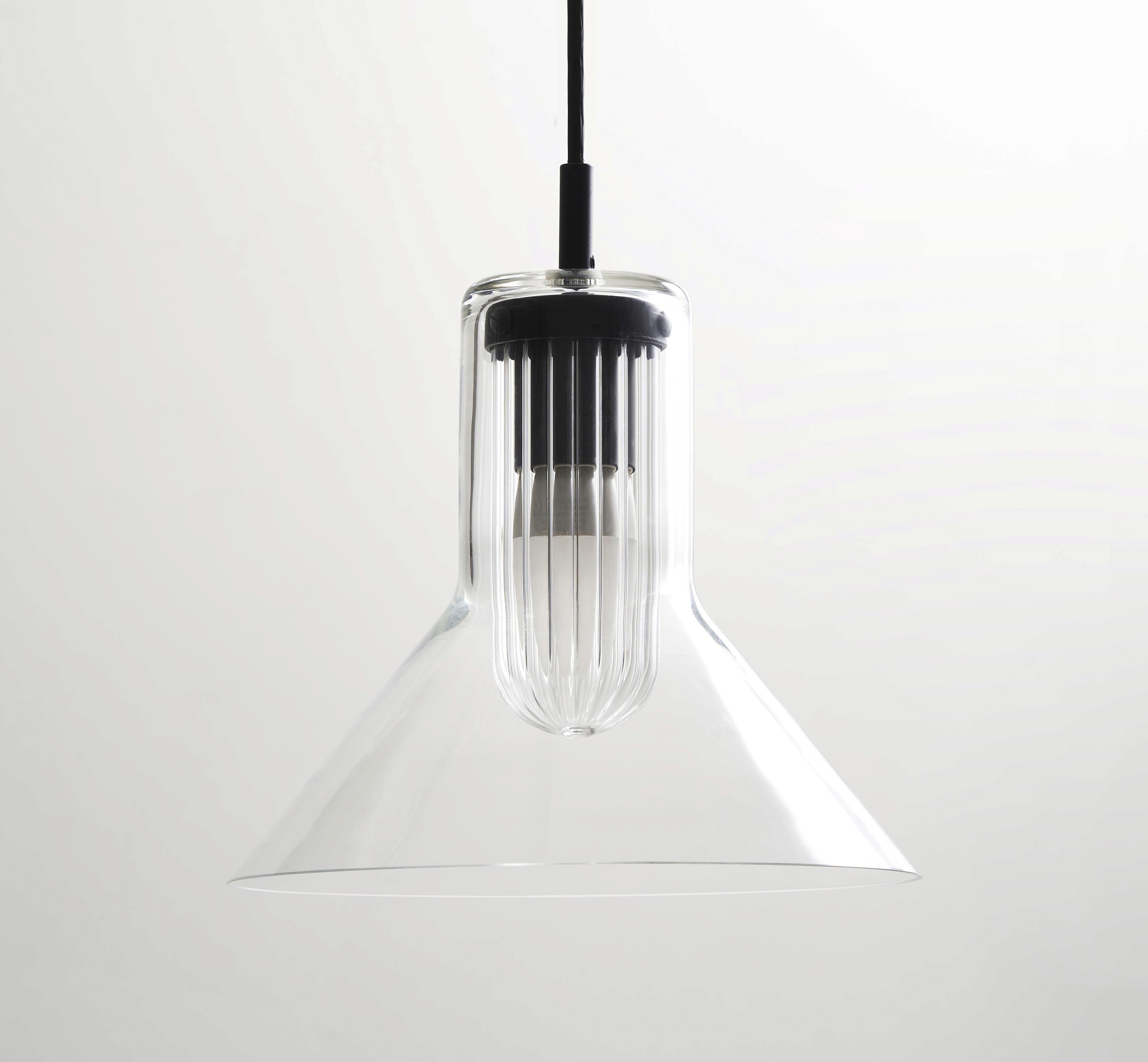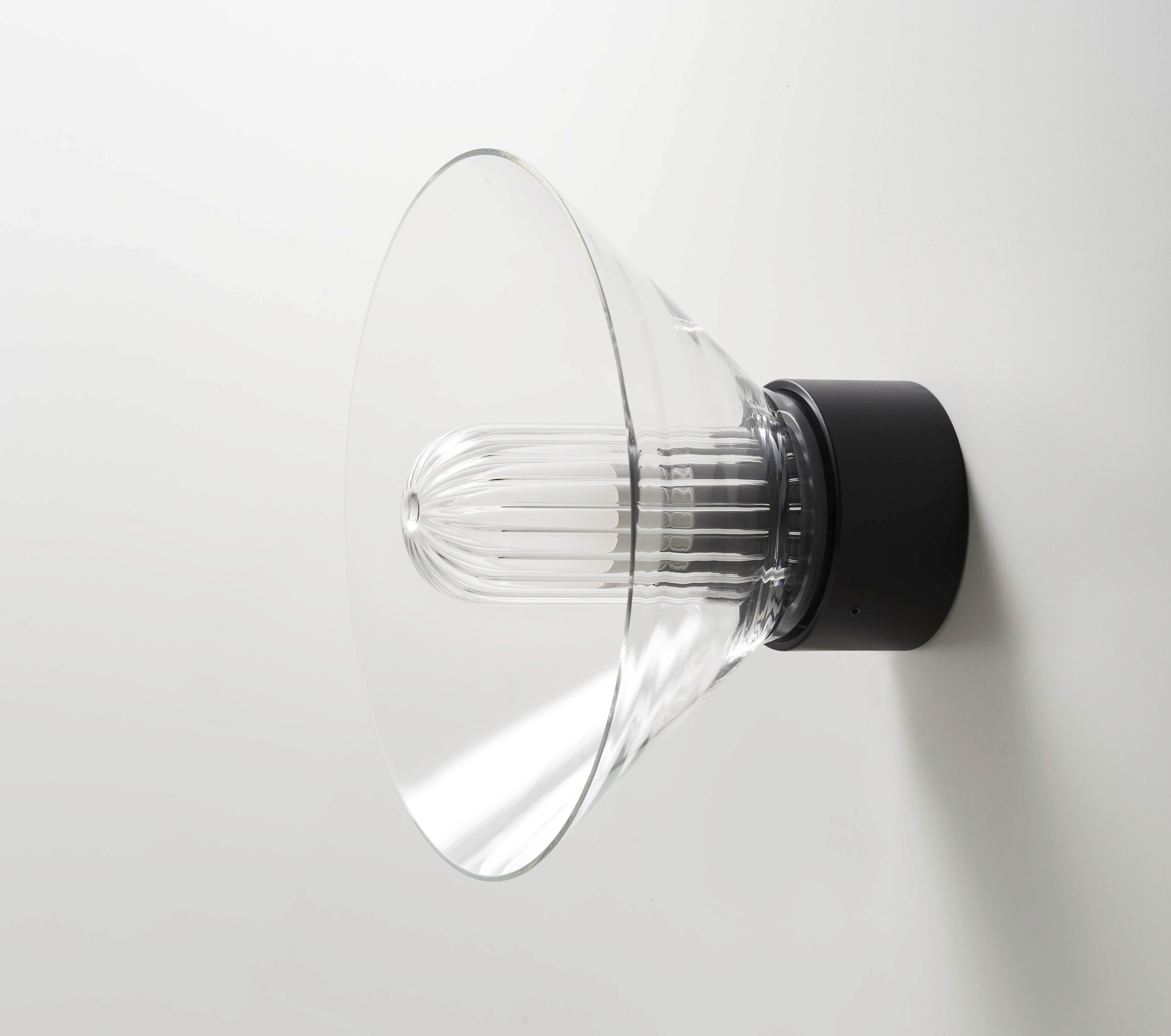 Peacock is a minimal lamp that reveals its hidden beauty as you pass by. A domed borosilicate glass diffuser is neatly positioned within the outer glass cone so that when illuminated a reflection fans out across the surface, reminiscent of a peacock’s plumage.