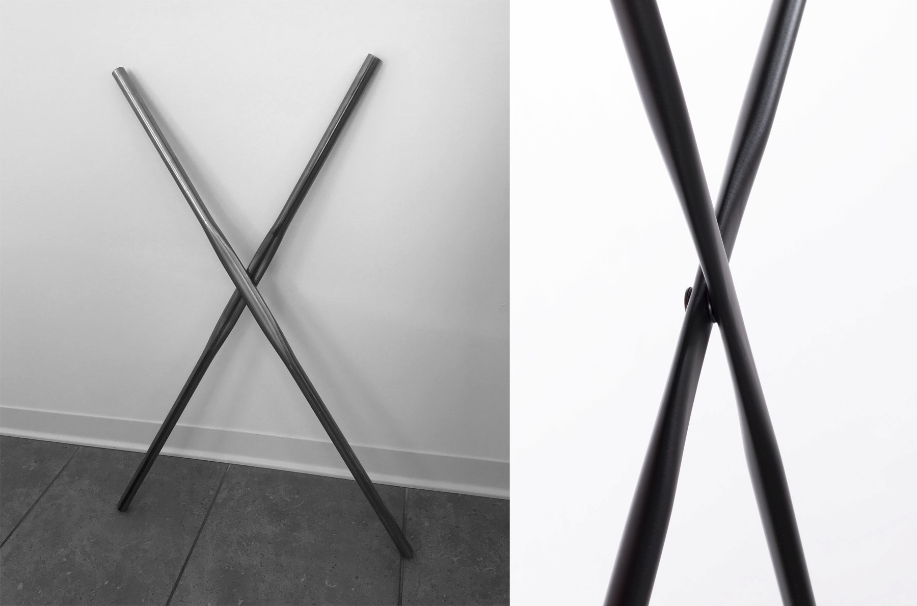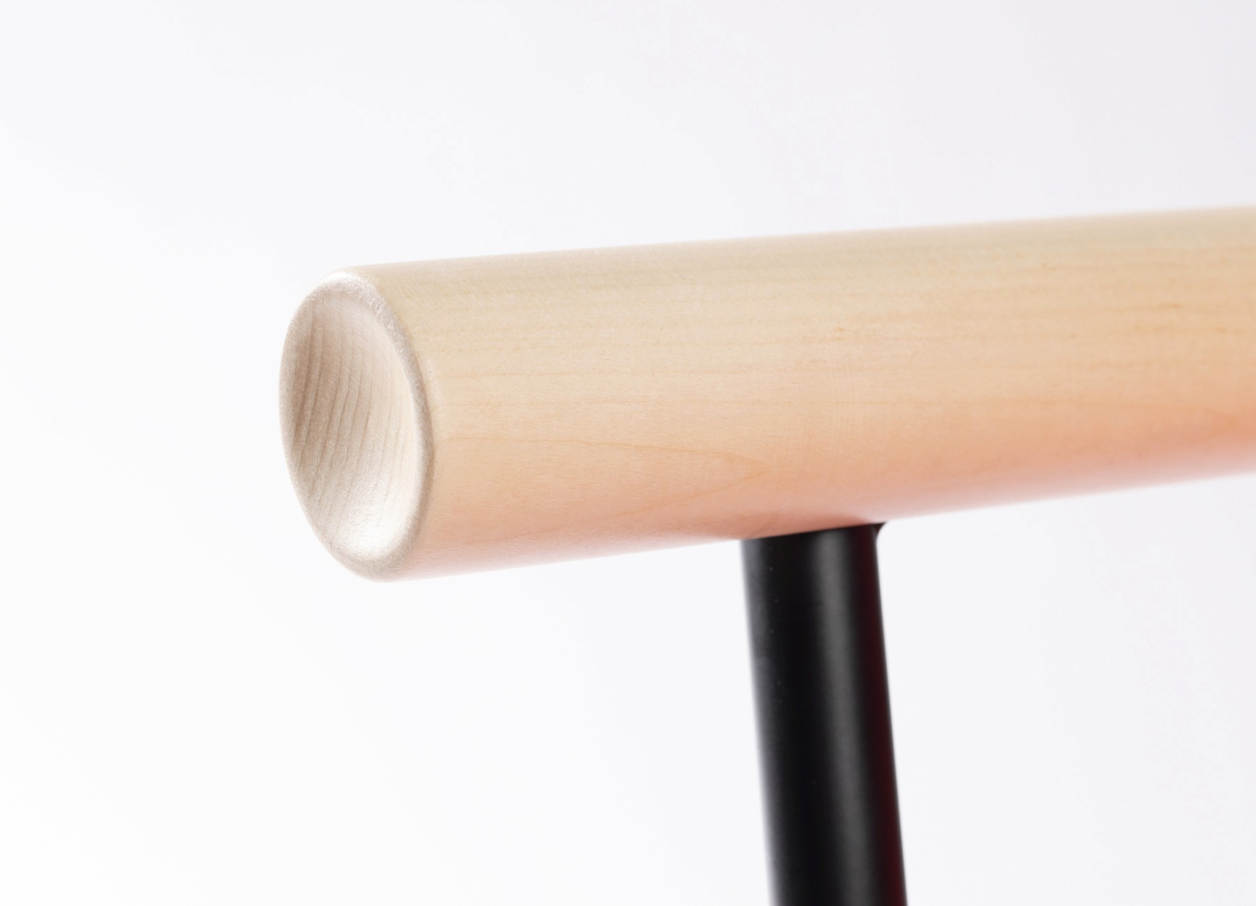Named Prop after its distinctive propeller-shaped, pressed tubular steel frame. The asymmetrical pressing,expertly crafted in the Treviso region of Italy, has a clean flat edge on the outside and inverted section on the inside.The turned maple arms have dished end details and machined recesses to accept the round capped frame.