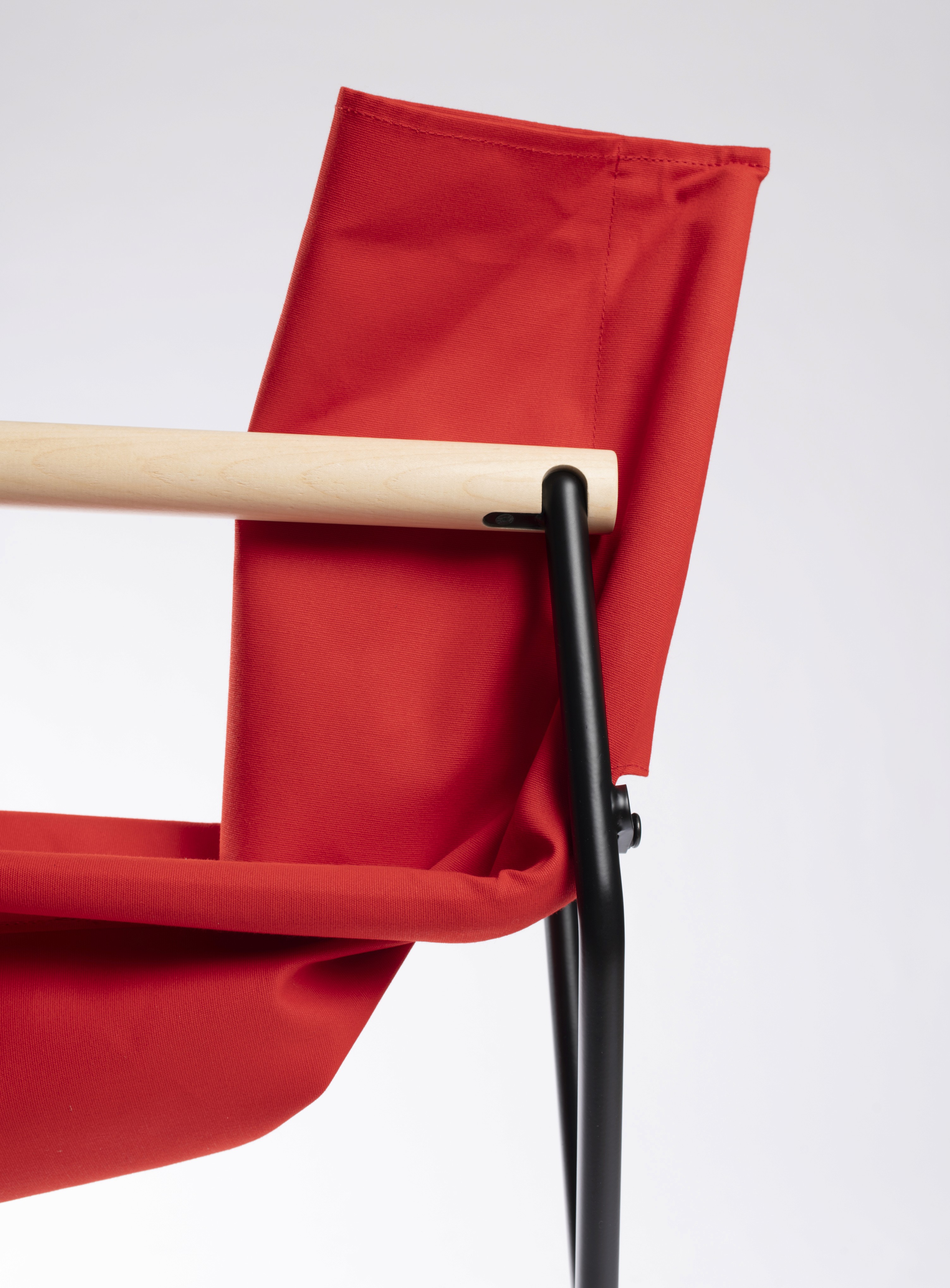 The main aim for Prop was to create an indoor / outdoor folding chair that had good ergonomics and a clean aesthetic. Usually fabric folding chairs have unsightly support struts across the back to act as a stopper and keep tension in the fabric. To help remove this detail we developed a hidden internal mechanism within the rear hinge that keeps the seat sling tension in the fabric.The rotating mechanism allows the arms to foldin one direction and then stop at 20 degrees in the other.The Fabric is also subtly shaped, tapering at the front and the rear so that the seat has more tension in these areas to improve comfort.