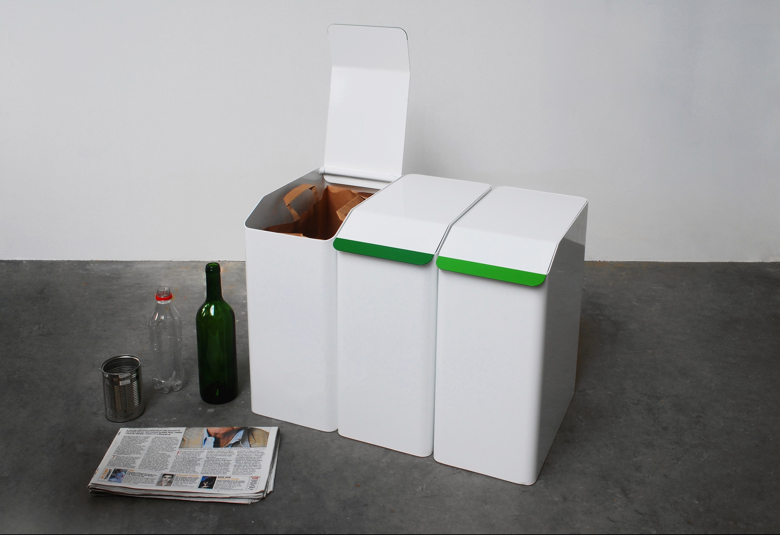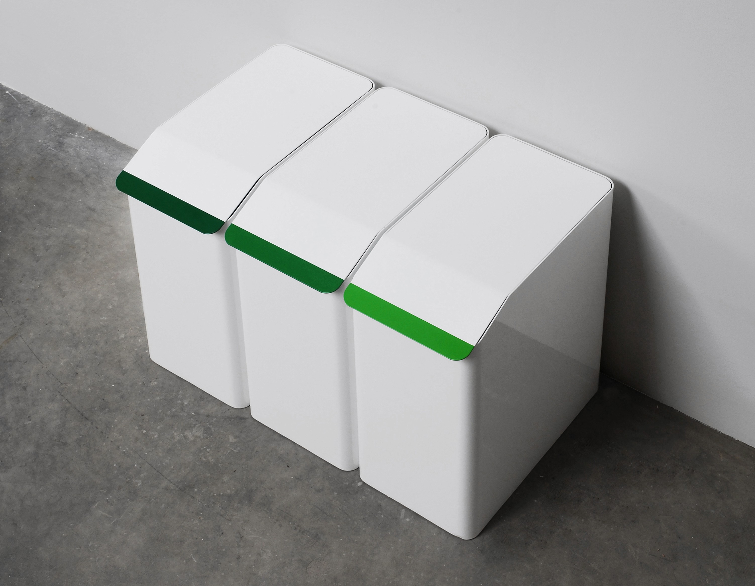 The powder coated aluminium boxes feature a flush lid with coloured tabs on the end to aid indexing of different materials such as paper, glass, metal and plastics. Each container is designed to fit the size of standard paper bags found at many large retailers. These can be re-used until recycled themselves. The containers can also be used individually for other household storage such as dirty linen or shoes.