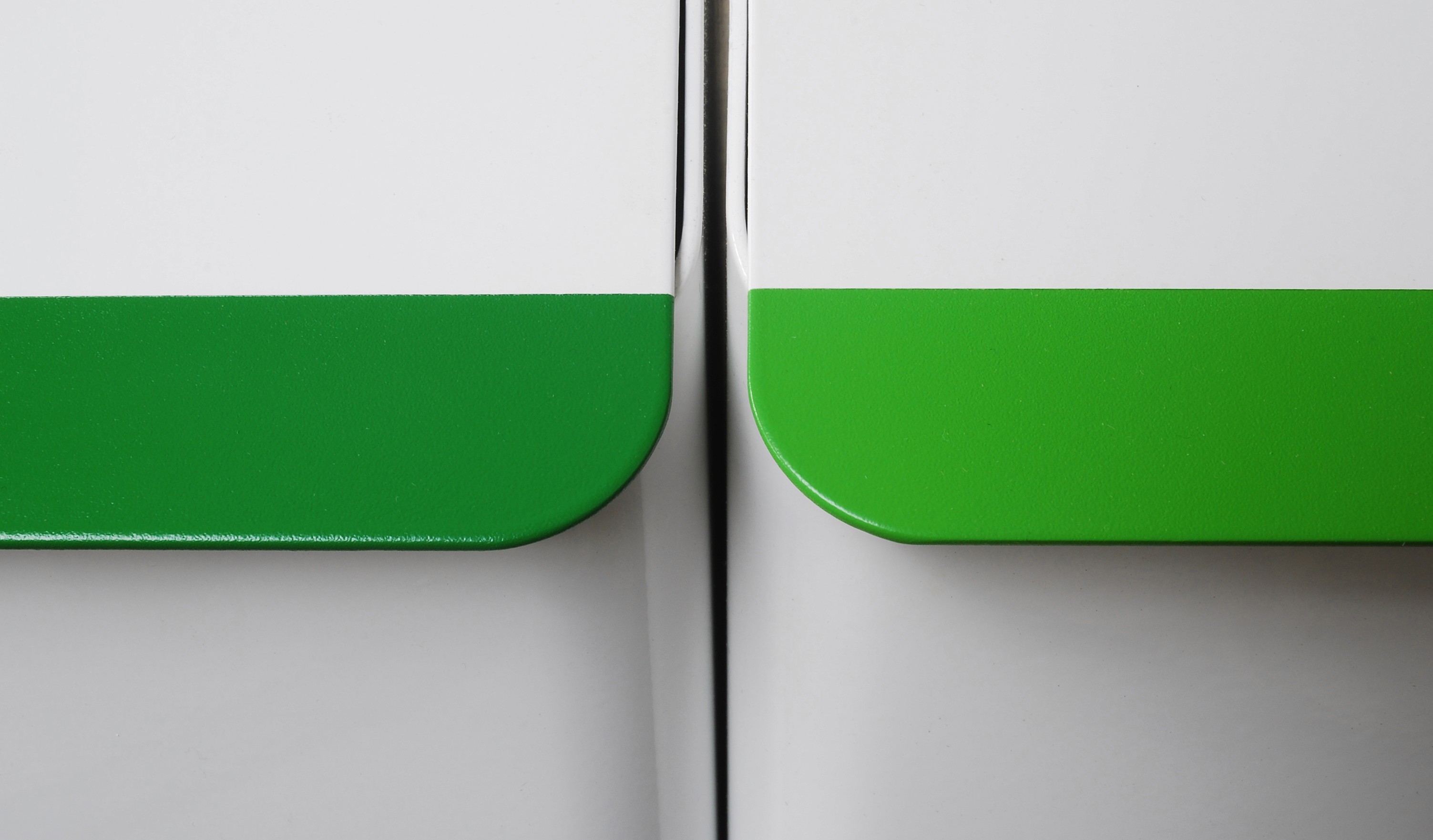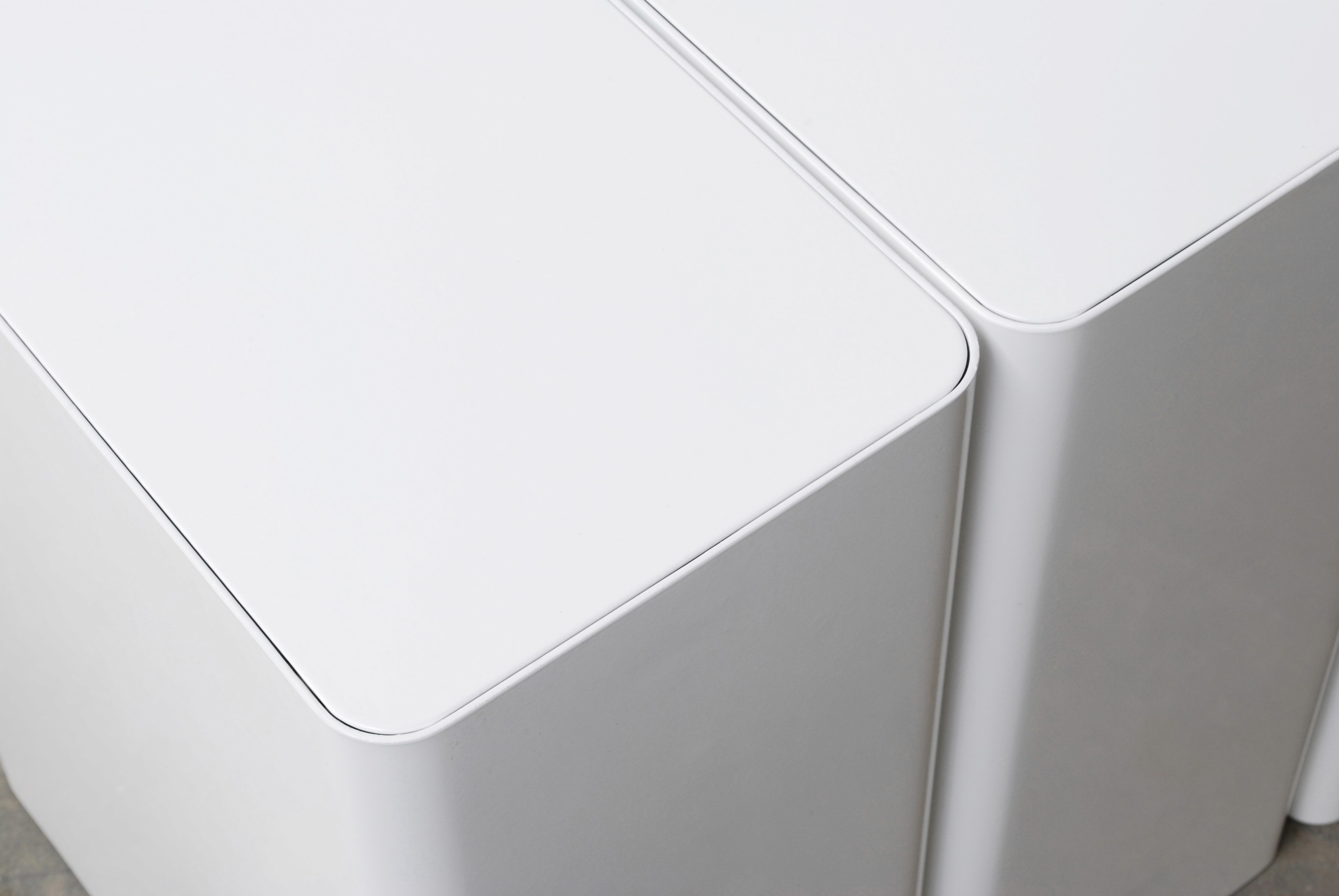 Each bin is constructed from three pieces of laser cut 3mm Aluminium sheet. The hinging lid is neatly recessed within the body and flows out over the front edge to create an ergonomic handle.