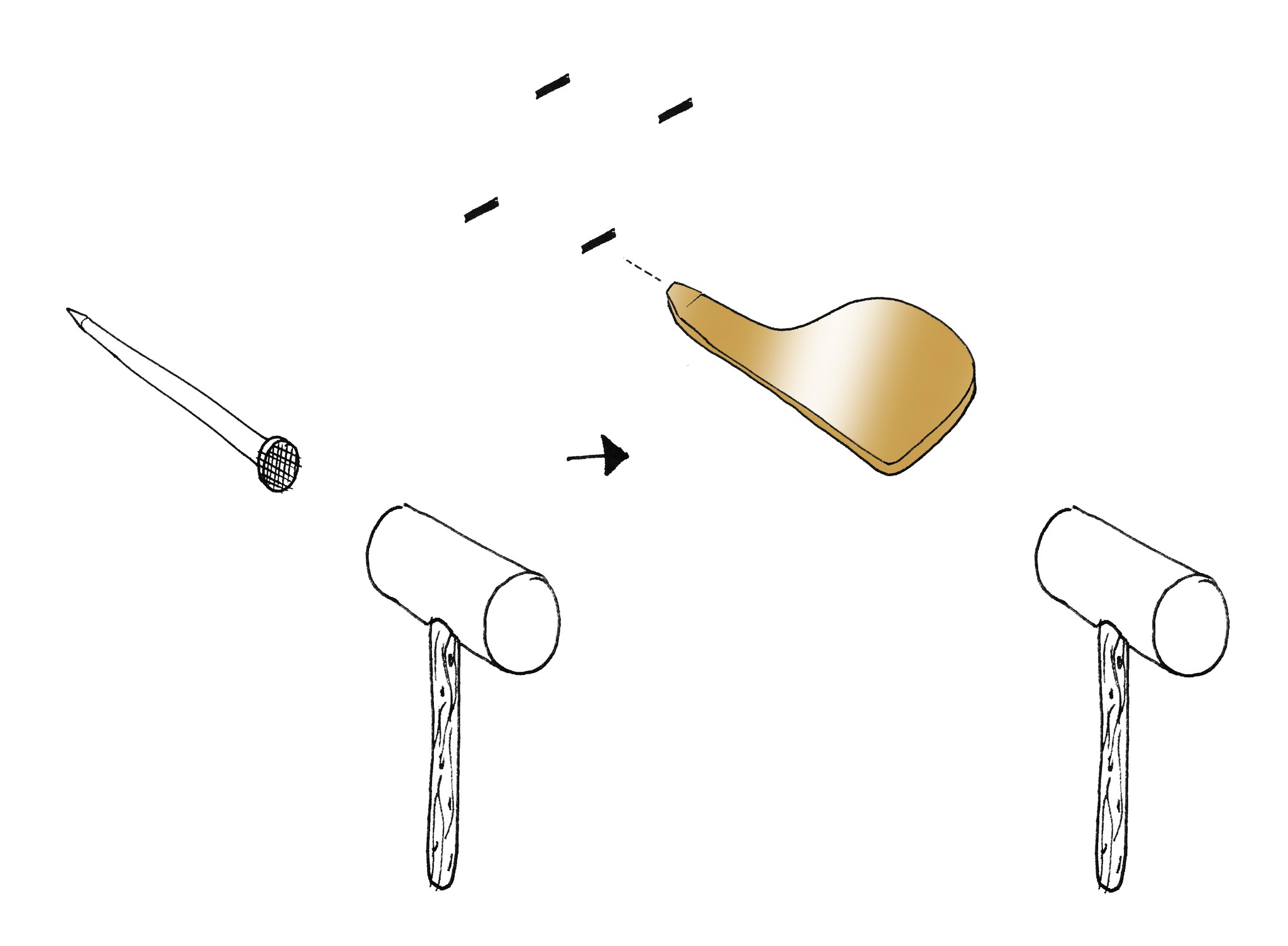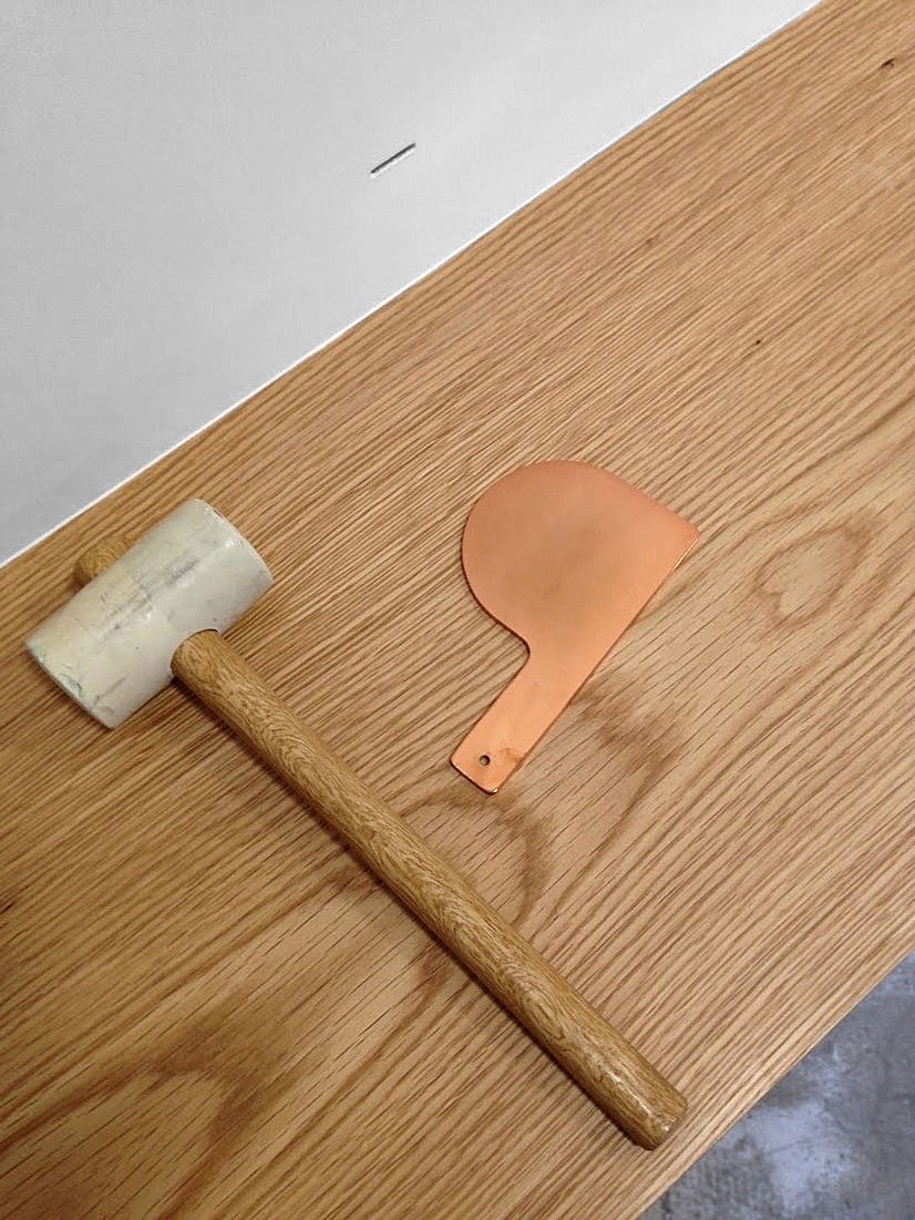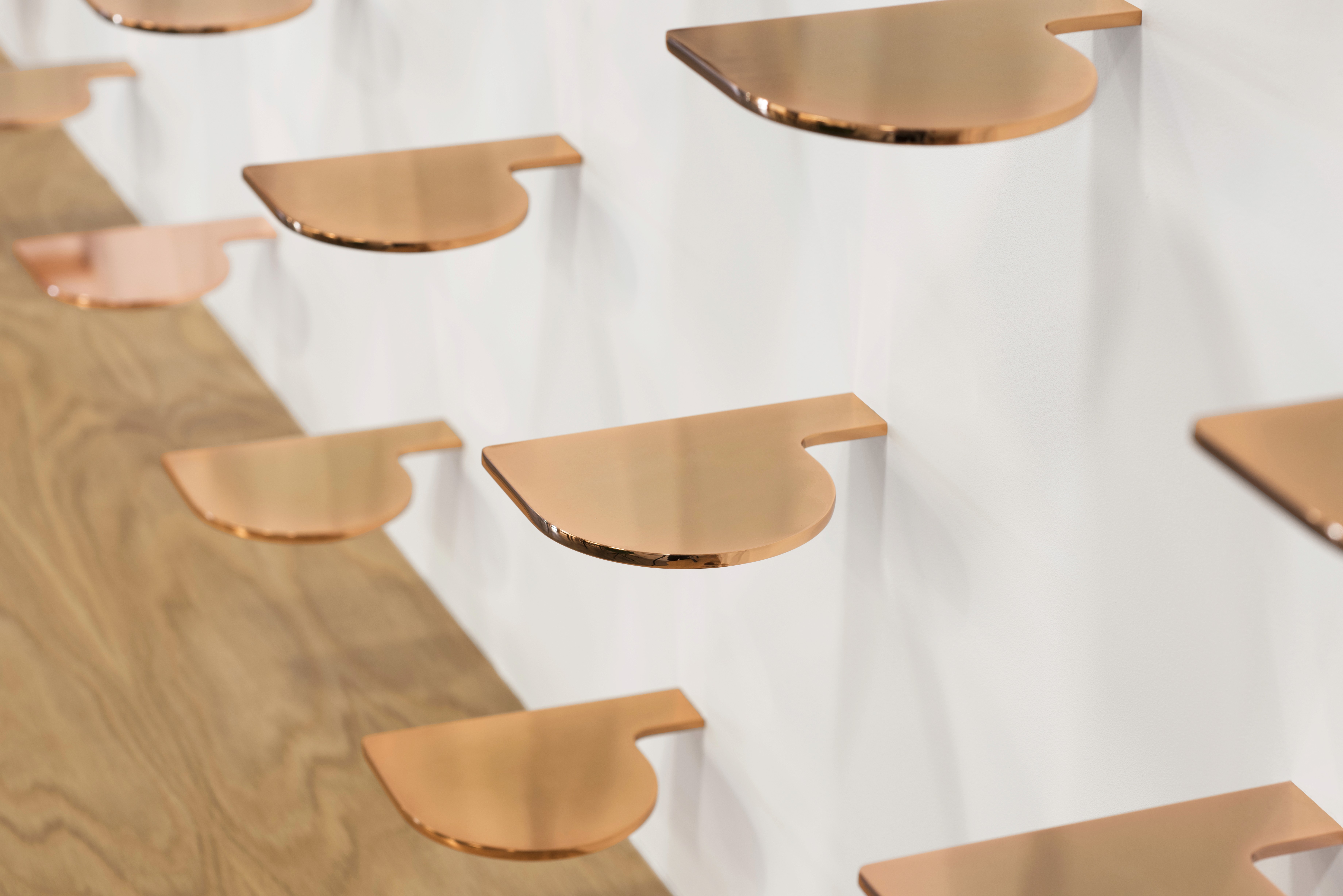 The display wall is made up from over 100 5mm copper plates that cantilever out from the wall. Each plate was hammered into pre-drilled slots within the painted plywood back wall so to remove the need for a visible support.