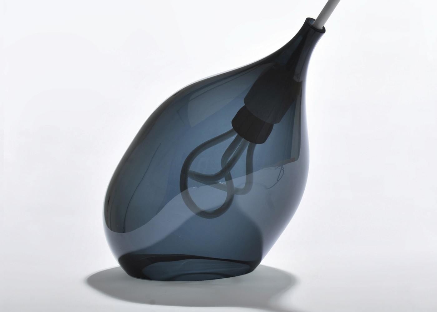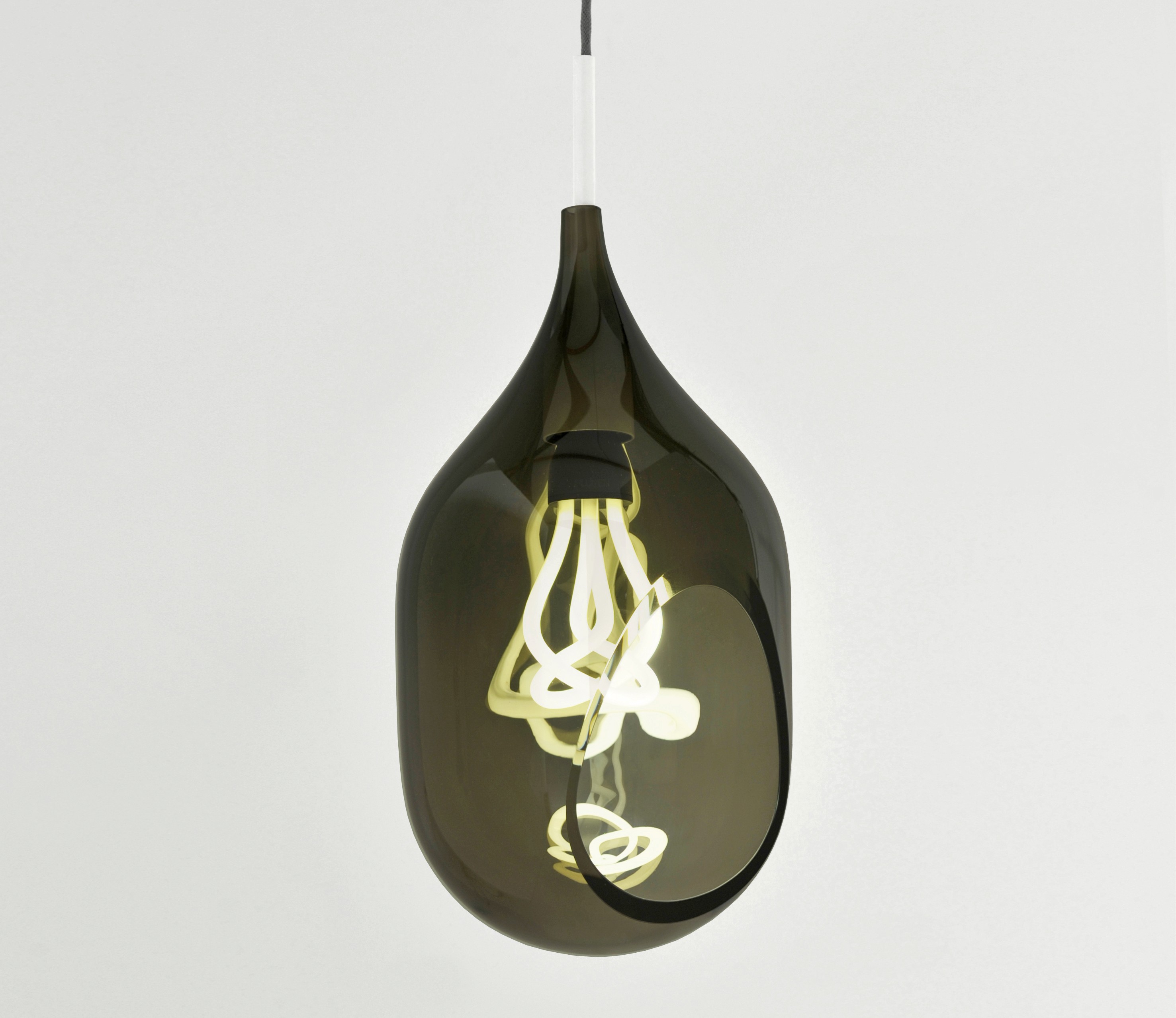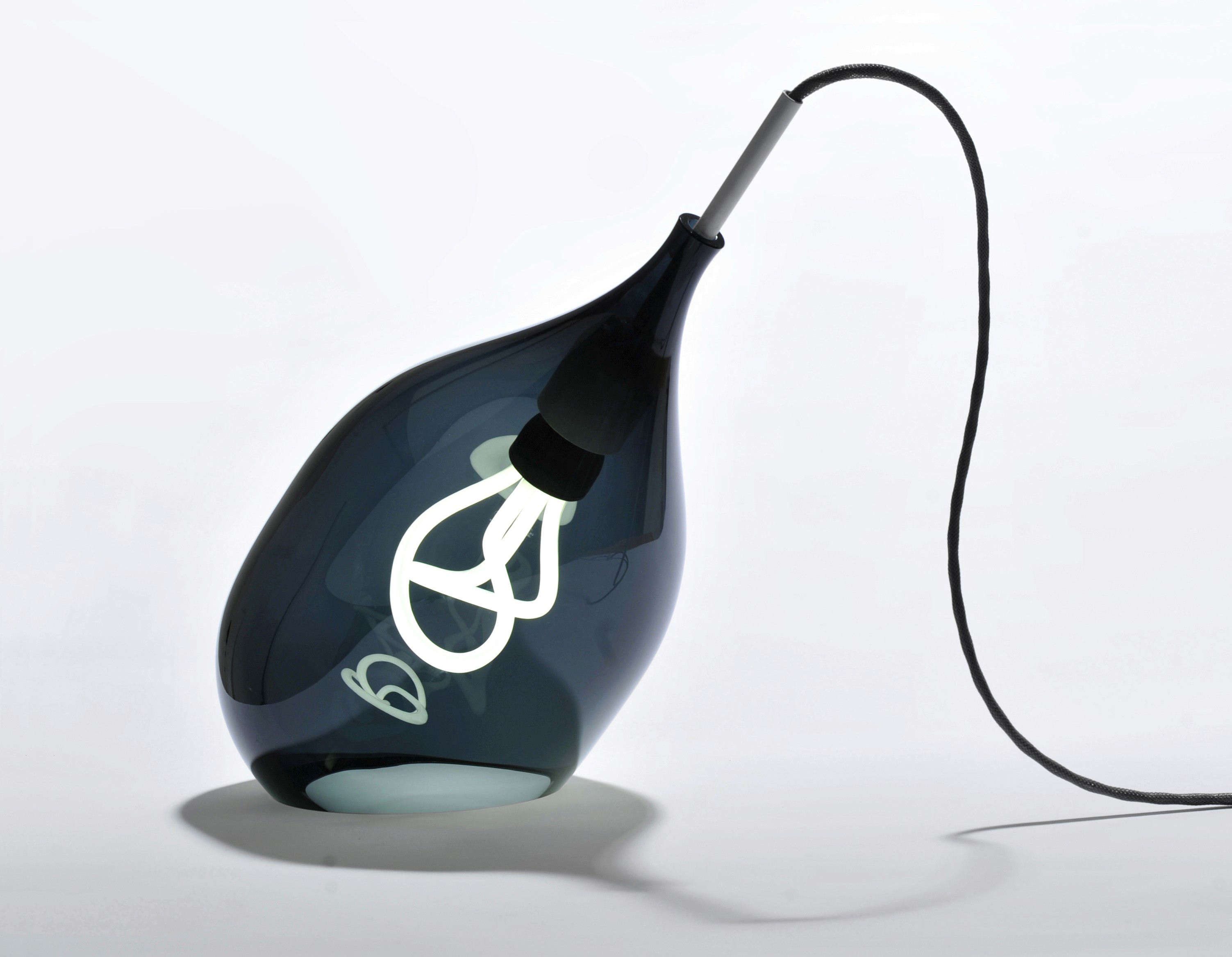 Influenced by the original Limited Edition Series, Vessel consists of a blown glass form designed specifically to celebrate the Plumen 001 bulb. When illuminated the glass tint mutes the light without hiding the form and produces an unexpected irregular reflection that appears holographic