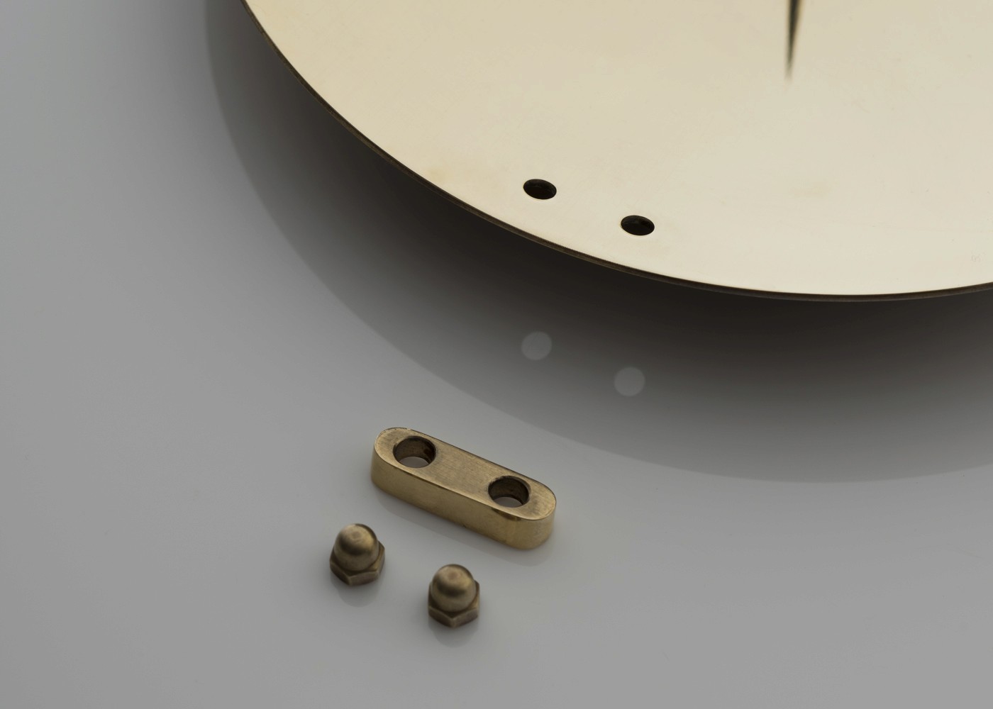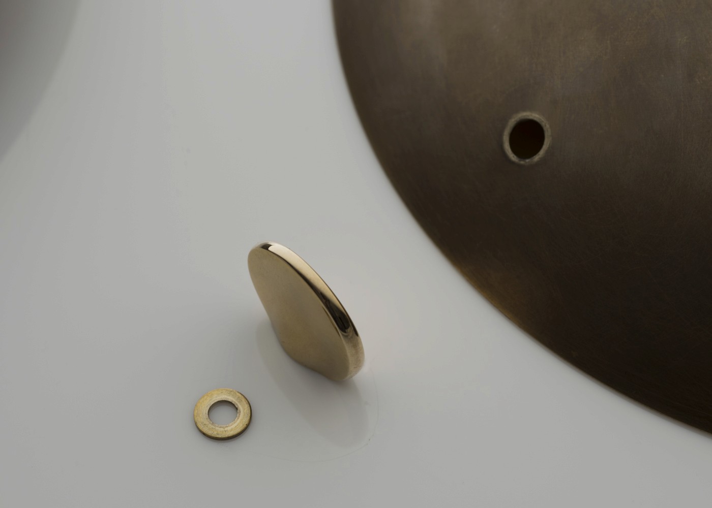 The weighted base allows the other three discs to cantilever up and around the candle producing a gravity defying appearance. The rear discs can be tensioned or repositioned via a handmade butterfly nut on the back. The candle visually floats above the disc via a central spike.