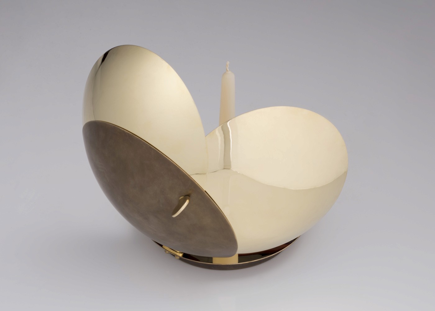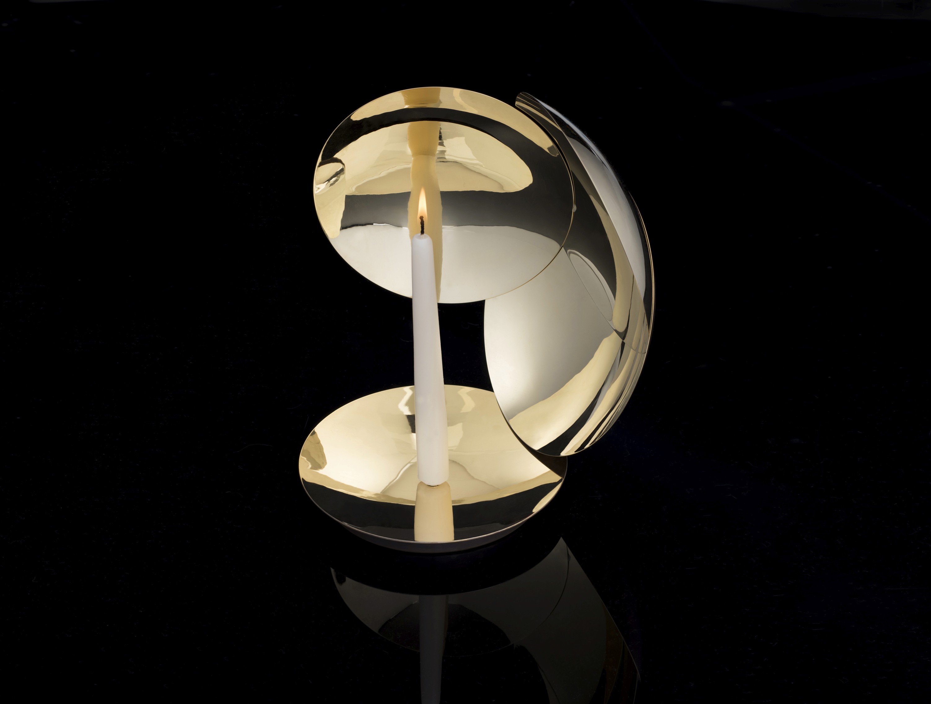 The form is based on four shifting discs, whose composition can be changed as desired, that move around a candle in spherical space. All parts are constructed from solid brass and have been handcrafted by Lobmeyr’s skilled master craftsmen.